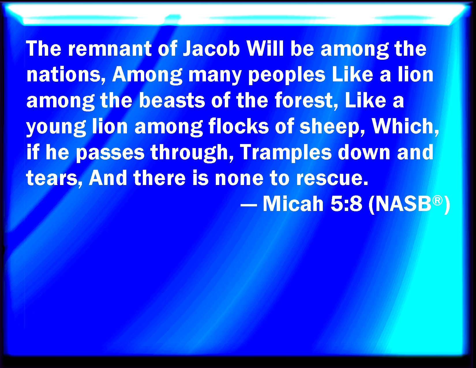 Bible Verse Slide Micah 5:8 And the remnant of Jacob shall be among the Gentiles in the middle of many people as a lion among the beasts of the forest, as a young lion among the flocks of sheep: who, if he go through, both treads down, and tears in pieces, and none can deliver. KJV: And the remnant of Jacob shall be among the Gentiles in the midst of many people as a lion among the beasts of the forest, as a young lion among the flocks of sheep: who, if he go through, both treadeth down, and teareth in pieces, and none can deliver. DRB: And the remnant of Jacob shall be among the Gentiles in the midst of many peoples as a lion among the beasts of the forests, and as a young lion among the docks of sheep: who when he shall go through and tread down, and take, there is none to deliver. DBT: And the remnant of Jacob shall be among the nations, in the midst of many peoples, as a lion among the beasts of the forest, as a young lion among the flocks of sheep: who, if he go through, treadeth down, and teareth in pieces, and there is none to deliver. ERV: And the remnant of Jacob shall be among the nations, in the midst of many peoples, as a lion among the beasts of the forest, as a young lion among the flocks of sheep: who, if he go through, treadeth down and teareth in pieces, and there is none to deliver. WBT: And the remnant of Jacob shall be among the gentiles in the midst of many people as a lion among the beasts of the forest, as a young lion among the flocks of sheep: who, if he goeth through, both treadeth down, and teareth in pieces, and none can deliver. WEB: The remnant of Jacob will be among the nations, in the midst of many peoples, like a lion among the animals of the forest, like a young lion among the flocks of sheep; who, if he goes through, treads down and tears in pieces, and there is no one to deliver. YLT: Yea, the remnant of Jacob hath been among nations, In the midst of many peoples, As a lion among beasts of a forest, As a young lion among ranks of a flock, Which if it hath passed through, Hath both trodden down and hath torn, And there is no deliverer.Links Micah 5:8 NIV • Micah 5:8 NLT • Micah 5:8 ESV • Micah 5:8 NASB • Micah 5:8 KJV • Micah 5:8 Interlinear • Micah 5:8 Commentaries • Micah 5:8 Parallel Texts • Micah 5:8 Bible Apps • Micah 5:8 Parallel • Bible Hub |
