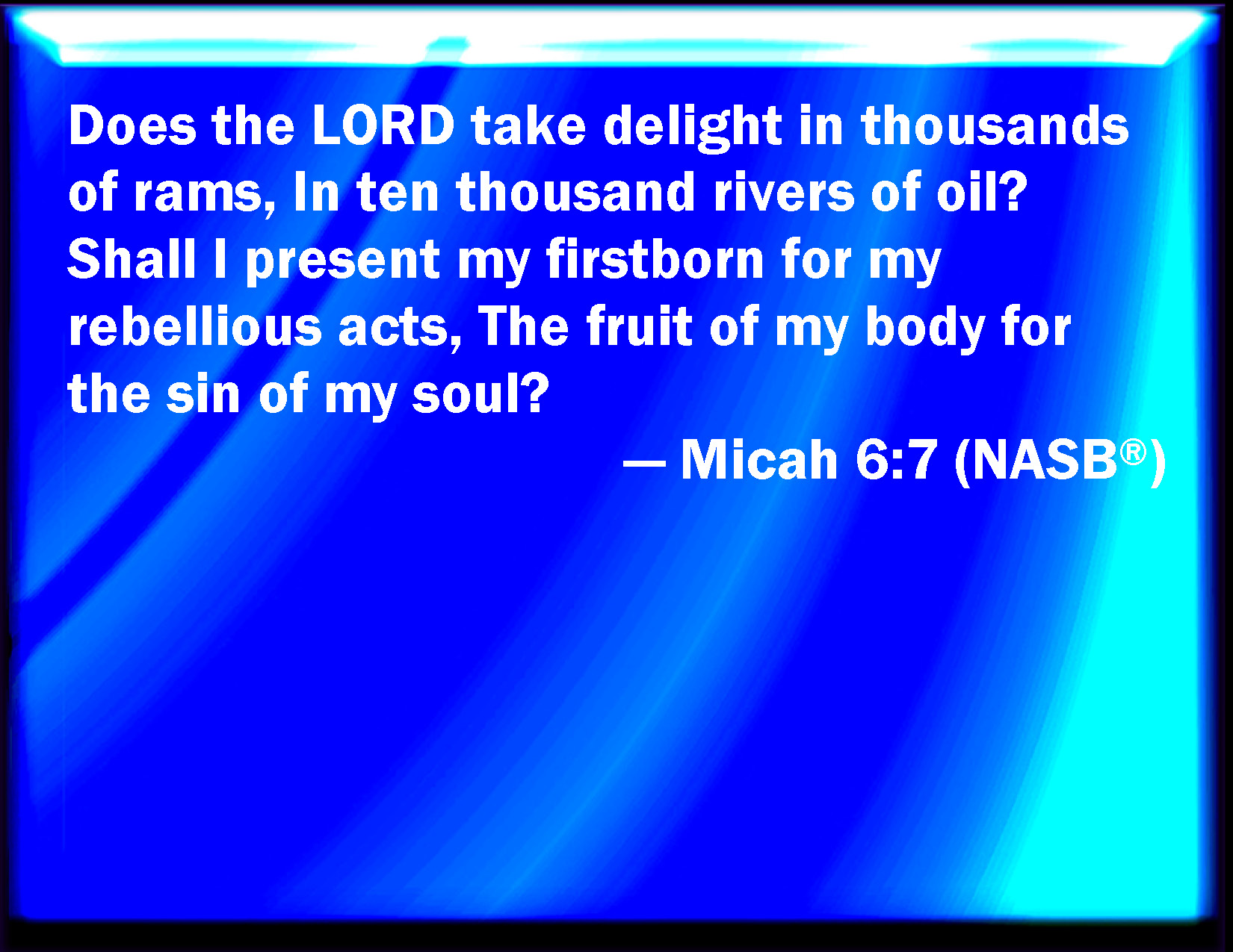 Bible Verse Slide Micah 6:7 Will the LORD be pleased with thousands of rams, or with ten thousands of rivers of oil? shall I give my firstborn for my transgression, the fruit of my body for the sin of my soul? KJV: Will the LORD be pleased with thousands of rams, or with ten thousands of rivers of oil? shall I give my firstborn for my transgression, the fruit of my body for the sin of my soul? DRB: May the Lord be appeased with thousands of rams, or with many thousands of fat he goats? shall I give my firstborn for my wickedness, the fruit of my body for the sin of my soul? DBT: Will Jehovah take pleasure in thousands of rams, in ten thousands of rivers of oil? Shall I give my firstborn for my transgression, the fruit of my body for the sin of my soul? ERV: will the LORD be pleased with thousands of rams, or with ten thousands of rivers of oil? shall I give my firstborn for my transgression, the fruit of my body for the sin of my soul? WBT: Will the LORD be pleased with thousands of rams, or with ten thousands of rivers of oil? shall I give my first-born for my transgression, the fruit of my body for the sin of my soul? WEB: Will Yahweh be pleased with thousands of rams? With tens of thousands of rivers of oil? Shall I give my firstborn for my disobedience? The fruit of my body for the sin of my soul? YLT: Is Jehovah pleased with thousands of rams? With myriads of streams of oil? Do I give my first-born for my transgression? The fruit of my body for the sin of my soul?Links Micah 6:7 NIV • Micah 6:7 NLT • Micah 6:7 ESV • Micah 6:7 NASB • Micah 6:7 KJV • Micah 6:7 Interlinear • Micah 6:7 Commentaries • Micah 6:7 Parallel Texts • Micah 6:7 Bible Apps • Micah 6:7 Parallel • Bible Hub |
