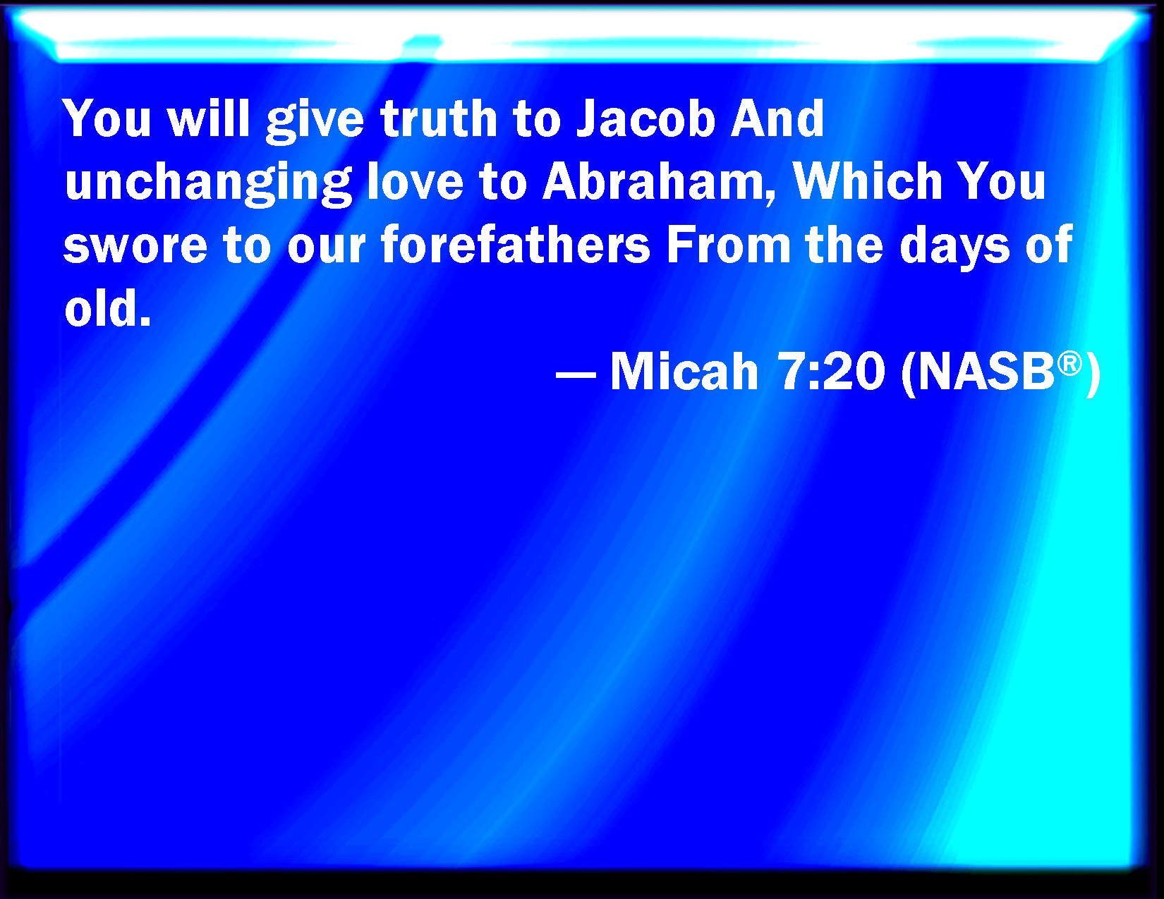 Bible Verse Slide Micah 7:20 You will perform the truth to Jacob, and the mercy to Abraham, which you have sworn to our fathers from the days of old. KJV: Thou wilt perform the truth to Jacob, and the mercy to Abraham, which thou hast sworn unto our fathers from the days of old. DRB: Thou wilt perform the truth of Jacob, the mercy to Abraham: which thou hast sworn to our fathers from the days of old. DBT: Thou wilt perform truth to Jacob, loving-kindness to Abraham, which thou hast sworn unto our fathers, from the days of old. ERV: Thou wilt perform the truth to Jacob, and the mercy to Abraham, which thou hast sworn unto our fathers from the days of old. WBT: Thou wilt perform the truth to Jacob, and the mercy to Abraham, which thou hast sworn to our fathers from the days of old. WEB: You will give truth to Jacob, and mercy to Abraham, as you have sworn to our fathers from the days of old. YLT: Thou givest truth to Jacob, kindness to Abraham, That thou hast sworn to our fathers, from the days of antiquity!Links Micah 7:20 NIV • Micah 7:20 NLT • Micah 7:20 ESV • Micah 7:20 NASB • Micah 7:20 KJV • Micah 7:20 Interlinear • Micah 7:20 Commentaries • Micah 7:20 Parallel Texts • Micah 7:20 Bible Apps • Micah 7:20 Parallel • Bible Hub |