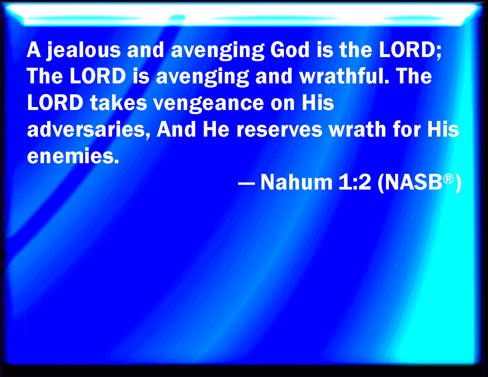 Bible Verse Slide Nahum 1:2 God is jealous, and the LORD revenges; the LORD revenges, and is furious; the LORD will take vengeance on his adversaries, and he reserves wrath for his enemies. KJV: God is jealous, and the LORD revengeth; the LORD revengeth, and is furious; the LORD will take vengeance on his adversaries, and he reserveth wrath for his enemies. DRB: The Lord is a jealous God, and a revenger: the Lord is a revenger, and hath wrath: the Lord taketh vengeance on his adversaries, and he is angry with his enemies. DBT: A jealous and avenging God is Jehovah: an avenger is Jehovah, and full of fury: Jehovah taketh vengeance on his adversaries, and he reserveth wrath for his enemies. ERV: The LORD is a jealous God and avengeth; the LORD avengeth and is full of wrath; the LORD taketh vengeance on his adversaries, and he reserveth wrath for his enemies. WBT: God is jealous, and the LORD avengeth; the LORD avengeth, and is furious; the LORD will take vengeance on his adversaries, and he reserveth wrath for his enemies. WEB: Yahweh is a jealous God and avenges. Yahweh avenges and is full of wrath. Yahweh takes vengeance on his adversaries, and he maintains wrath against his enemies. YLT: A God zealous and avenging is Jehovah, An avenger is Jehovah, and possessing fury. An avenger is Jehovah on His adversaries, And He is watching for His enemies.Links Nahum 1:2 NIV • Nahum 1:2 NLT • Nahum 1:2 ESV • Nahum 1:2 NASB • Nahum 1:2 KJV • Nahum 1:2 Interlinear • Nahum 1:2 Commentaries • Nahum 1:2 Parallel Texts • Nahum 1:2 Bible Apps • Nahum 1:2 Parallel • Bible Hub |