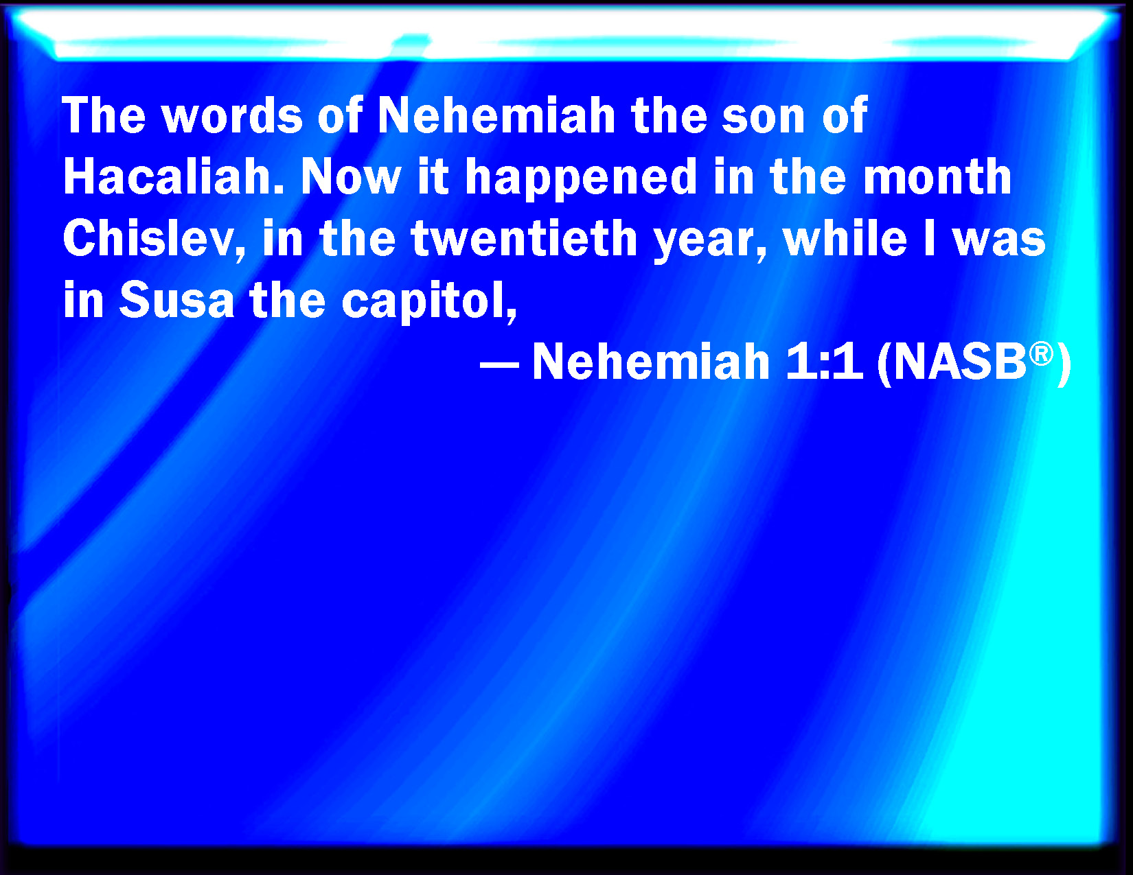 Bible Verse Slide Nehemiah 1:1 The words of Nehemiah the son of Hachaliah. And it came to pass in the month Chisleu, in the twentieth year, as I was in Shushan the palace, KJV: The words of Nehemiah the son of Hachaliah. And it came to pass in the month Chisleu, in the twentieth year, as I was in Shushan the palace, DRB: The words of Nehemias the son of Helchias. And it came to pass in the month of Casleu, in the twentieth year, as I was in the castle of Susa, DBT: The words of Nehemiah the son of Hachaliah. And it came to pass in the month Chislev, in the twentieth year, as I was in Shushan the fortress, ERV: The words of Nehemiah the son of Hacaliah. Now it came to pass in the month Chislev, in the twentieth year, as I was in Shushan the palace, WBT: The words of Nehemiah the son of Hachaliah. And it came to pass in the month Chisleu, in the twentieth year, as I was in Shushan the palace, WEB: The words of Nehemiah the son of Hacaliah. Now it happened in the month Chislev, in the twentieth year, as I was in Shushan the palace, YLT: Words of Nehemiah son of Hachaliah. And it cometh to pass, in the month of Chisleu, the twentieth year, and I have been in Shushan the palace,Links Nehemiah 1:1 NIV • Nehemiah 1:1 NLT • Nehemiah 1:1 ESV • Nehemiah 1:1 NASB • Nehemiah 1:1 KJV • Nehemiah 1:1 Interlinear • Nehemiah 1:1 Commentaries • Nehemiah 1:1 Parallel Texts • Nehemiah 1:1 Bible Apps • Nehemiah 1:1 Parallel • Bible Hub |