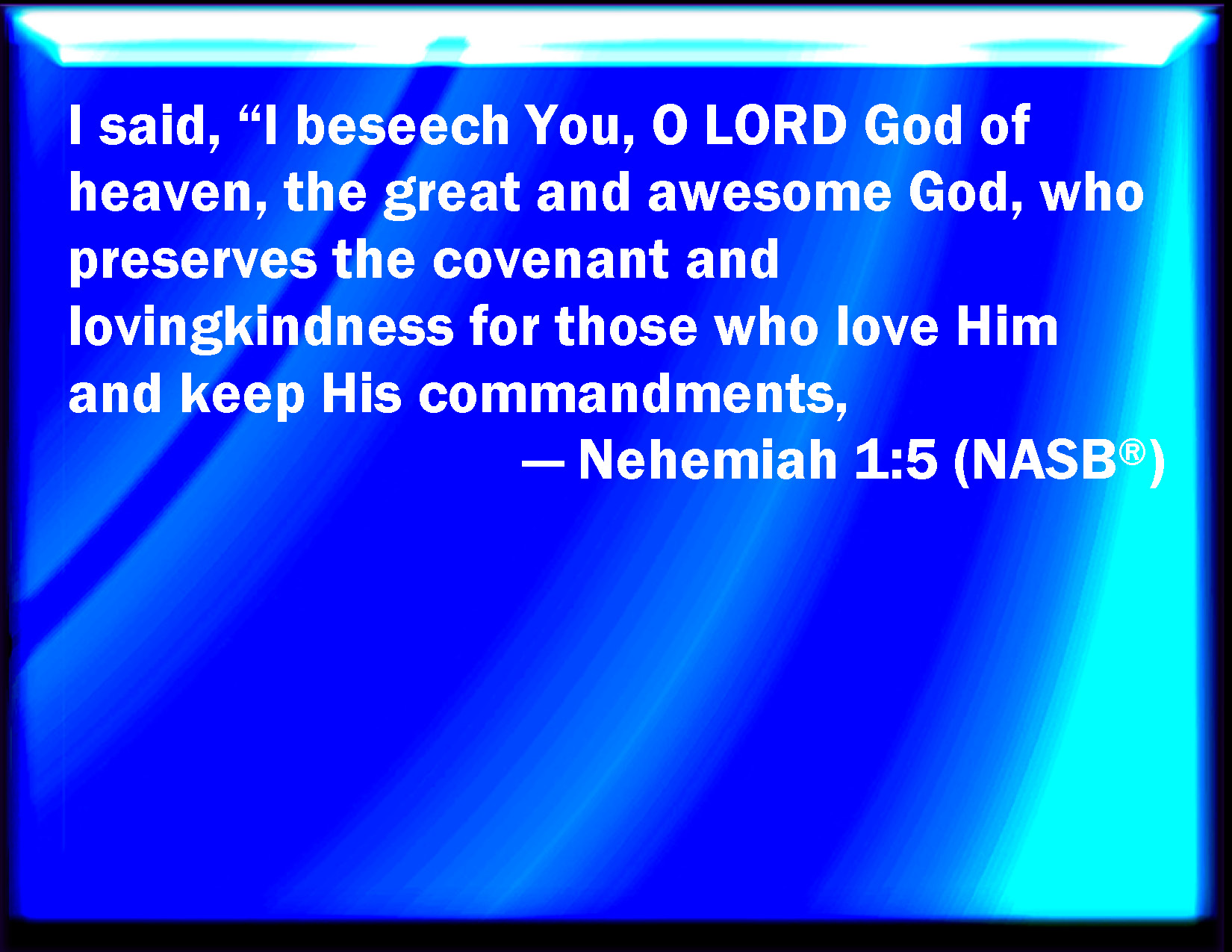 Bible Verse Slide Nehemiah 1:5 And said, I beseech you, O LORD God of heaven, the great and terrible God, that keeps covenant and mercy for them that love him and observe his commandments: KJV: And said, I beseech thee, O LORD God of heaven, the great and terrible God, that keepeth covenant and mercy for them that love him and observe his commandments: DRB: And I said: WI beseech thee, 0 Lord God of heaven, strong, great, and terrible, who keepest covenant and mercy with those that love thee, and keep thy commandments : DBT: and said, I beseech thee, Jehovah, God of the heavens, the great and terrible God, that keepeth covenant and mercy for them that love him and keep his commandments. ERV: and said, I beseech thee, O LORD, the God of heaven, the great and terrible God, that keepeth covenant and mercy with them that love him and keep his commandments: WBT: And said, I beseech thee, O LORD God of heaven, the great and terrible God, that keepeth covenant and mercy for them that love him and observe his commandments: WEB: and said, "I beg you, Yahweh, the God of heaven, the great and awesome God, who keeps covenant and loving kindness with those who love him and keep his commandments: YLT: And I say, 'I beseech thee, O Jehovah, God of the heavens, God, the great and the fearful, keeping the covenant and kindness for those loving Him, and for those keeping His commands,Links Nehemiah 1:5 NIV • Nehemiah 1:5 NLT • Nehemiah 1:5 ESV • Nehemiah 1:5 NASB • Nehemiah 1:5 KJV • Nehemiah 1:5 Interlinear • Nehemiah 1:5 Commentaries • Nehemiah 1:5 Parallel Texts • Nehemiah 1:5 Bible Apps • Nehemiah 1:5 Parallel • Bible Hub |