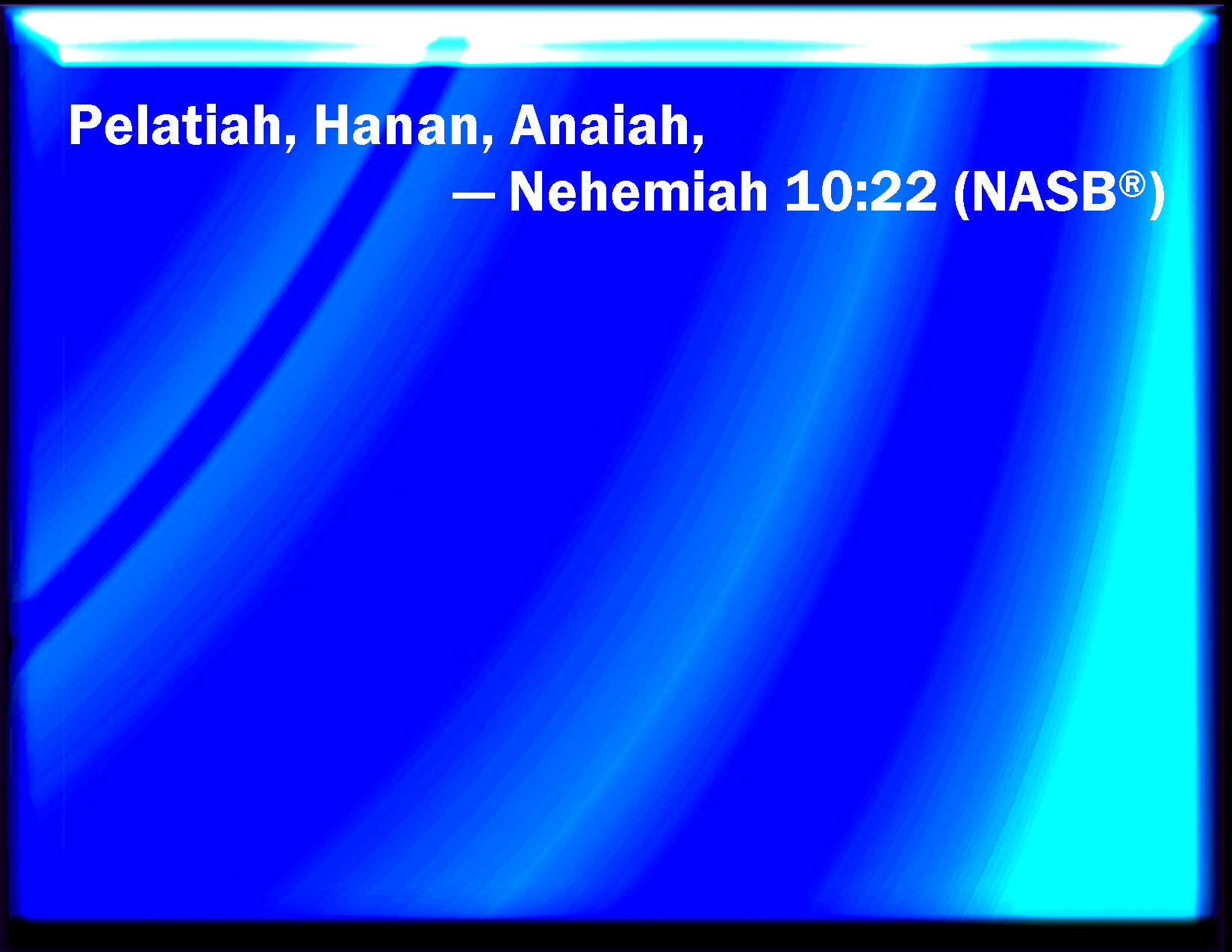 Bible Verse Slide Nehemiah 10:22 Pelatiah, Hanan, Anaiah, KJV: Pelatiah, Hanan, Anaiah, DRB: Pheltia, Hanan, Anaia, DBT: Pelatiah, Hanan, Anaiah, ERV: Pelatiah, Hanan, Anaiah; WBT: Pelatiah, Hanan, Anaiah, WEB: Pelatiah, Hanan, Anaiah, YLT: Pelatiah, Hanan, Anaiah,Links Nehemiah 10:22 NIV • Nehemiah 10:22 NLT • Nehemiah 10:22 ESV • Nehemiah 10:22 NASB • Nehemiah 10:22 KJV • Nehemiah 10:22 Interlinear • Nehemiah 10:22 Commentaries • Nehemiah 10:22 Parallel Texts • Nehemiah 10:22 Bible Apps • Nehemiah 10:22 Parallel • Bible Hub |