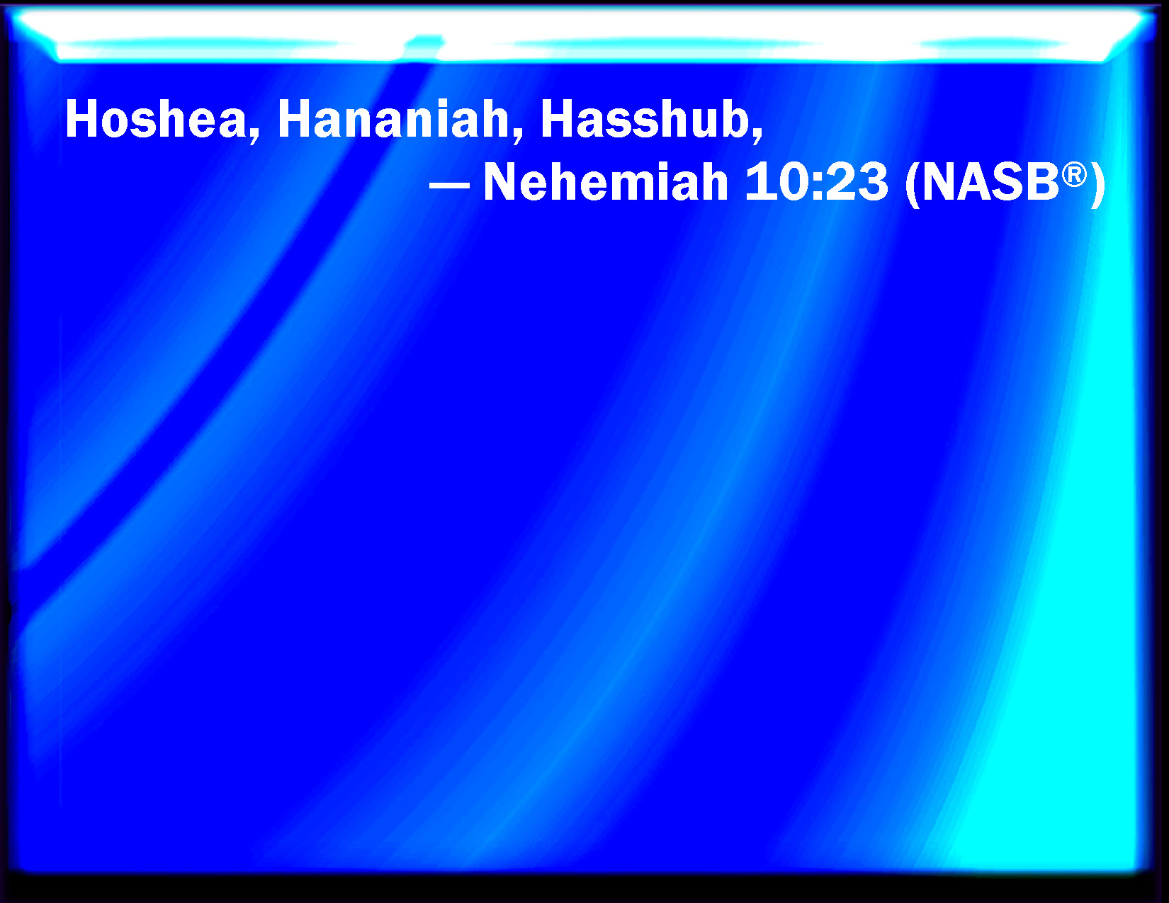 Bible Verse Slide Nehemiah 10:23 Hoshea, Hananiah, Hashub, KJV: Hoshea, Hananiah, Hashub, DRB: Osee, Hanania, Hasub, DBT: Hoshea, Hananiah, Hashub, ERV: Hoshea, Hananiah, Hasshub; WBT: Hoshea, Hananiah, Hashub, WEB: Hoshea, Hananiah, Hasshub, YLT: Hoshea, Hananiah, Hashub,Links Nehemiah 10:23 NIV • Nehemiah 10:23 NLT • Nehemiah 10:23 ESV • Nehemiah 10:23 NASB • Nehemiah 10:23 KJV • Nehemiah 10:23 Interlinear • Nehemiah 10:23 Commentaries • Nehemiah 10:23 Parallel Texts • Nehemiah 10:23 Bible Apps • Nehemiah 10:23 Parallel • Bible Hub |