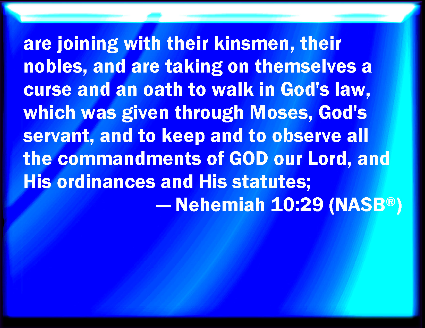 Bible Verse Slide Nehemiah 10:29 They joined to their brothers, their nobles, and entered into a curse, and into an oath, to walk in God's law, which was given by Moses the servant of God, and to observe and do all the commandments of the LORD our Lord, and his judgments and his statutes; KJV: They clave to their brethren, their nobles, and entered into a curse, and into an oath, to walk in God's law, which was given by Moses the servant of God, and to observe and do all the commandments of the LORD our Lord, and his judgments and his statutes; DRB: All that could understand promising for their brethren, with their chief men, and they came to promise, and swear that they would walk in the law of God, which he gave in the hand of Moses the servant of God, that they would do and keep all the commandments of the Lord our God, and his judgments and his ceremonies. DBT: joined with their brethren, their nobles, and entered into a curse and into an oath, to walk in the law of God, which had been given by Moses the servant of God, and to keep and do all the commandments of Jehovah our Lord, and his ordinances and his statutes; ERV: They clave to their brethren, their nobles, and entered into a curse, and into an oath, to walk in God's law, which was given by Moses the servant of God, and to observe and to do all the commandments of the LORD our Lord, and his judgments and his statutes; WBT: They united with their brethren, their nobles, and entered into a curse, and into an oath, to walk in God's law, which was given by Moses the servant of God, and to observe and do all the commandments of the LORD our Lord, and his judgments and his statutes; WEB: they joined with their brothers, their nobles, and entered into a curse, and into an oath, to walk in God's law, which was given by Moses the servant of God, and to observe and do all the commandments of Yahweh our Lord, and his ordinances and his statutes; YLT: are laying hold on their brethren, their honourable ones, and coming in to an execration, and in to an oath, to walk in the law of God, that was given by the hand of Moses, servant of God, and to observe and to do all the commands of Jehovah our Lord, and His judgments, and His statutes;Links Nehemiah 10:29 NIV • Nehemiah 10:29 NLT • Nehemiah 10:29 ESV • Nehemiah 10:29 NASB • Nehemiah 10:29 KJV • Nehemiah 10:29 Interlinear • Nehemiah 10:29 Commentaries • Nehemiah 10:29 Parallel Texts • Nehemiah 10:29 Bible Apps • Nehemiah 10:29 Parallel • Bible Hub |