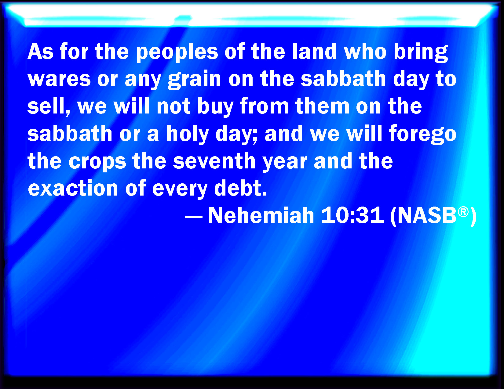 Bible Verse Slide Nehemiah 10:31 And if the people of the land bring ware or any victuals on the sabbath day to sell, that we would not buy it of them on the sabbath, or on the holy day: and that we would leave the seventh year, and the exaction of every debt. KJV: And if the people of the land bring ware or any victuals on the sabbath day to sell, that we would not buy it of them on the sabbath, or on the holy day: and that we would leave the seventh year, and the exaction of every debt. DRB: And if the people of the land bring in things to sell, or any things for use, to sell them on the sabbath day, that we would not buy them of them on the sabbath, or on the holy day. And that we would leave the seventh year, and the exaction of every hand. DBT: and that if the peoples of the land brought wares or any grain on the sabbath day to sell, we would not take it of them on the sabbath, or on any holy day; and that we would leave the land uncultivated the seventh year, and the exaction of every debt. ERV: and if the peoples of the land bring ware or any victuals on the sabbath day to sell, that we would not buy of them on the sabbath, or on a holy day: and that we would forgo the seventh year, and the exaction of every debt. WBT: And if the people of the land should bring wares or any provisions on the sabbath day to sell, that we would not buy it of them on the sabbath, or on the holy day: and that we would leave the seventh year, and the exaction of every debt. WEB: and if the peoples of the land bring wares or any grain on the Sabbath day to sell, that we would not buy of them on the Sabbath, or on a holy day; and that we would forego the seventh year, and the exaction of every debt. YLT: and the peoples of the land who are bringing in the wares and any corn on the sabbath-day to sell, we receive not of them on the sabbath, and on a holy day, and we leave the seventh year, and usury on every hand.Links Nehemiah 10:31 NIV • Nehemiah 10:31 NLT • Nehemiah 10:31 ESV • Nehemiah 10:31 NASB • Nehemiah 10:31 KJV • Nehemiah 10:31 Interlinear • Nehemiah 10:31 Commentaries • Nehemiah 10:31 Parallel Texts • Nehemiah 10:31 Bible Apps • Nehemiah 10:31 Parallel • Bible Hub |