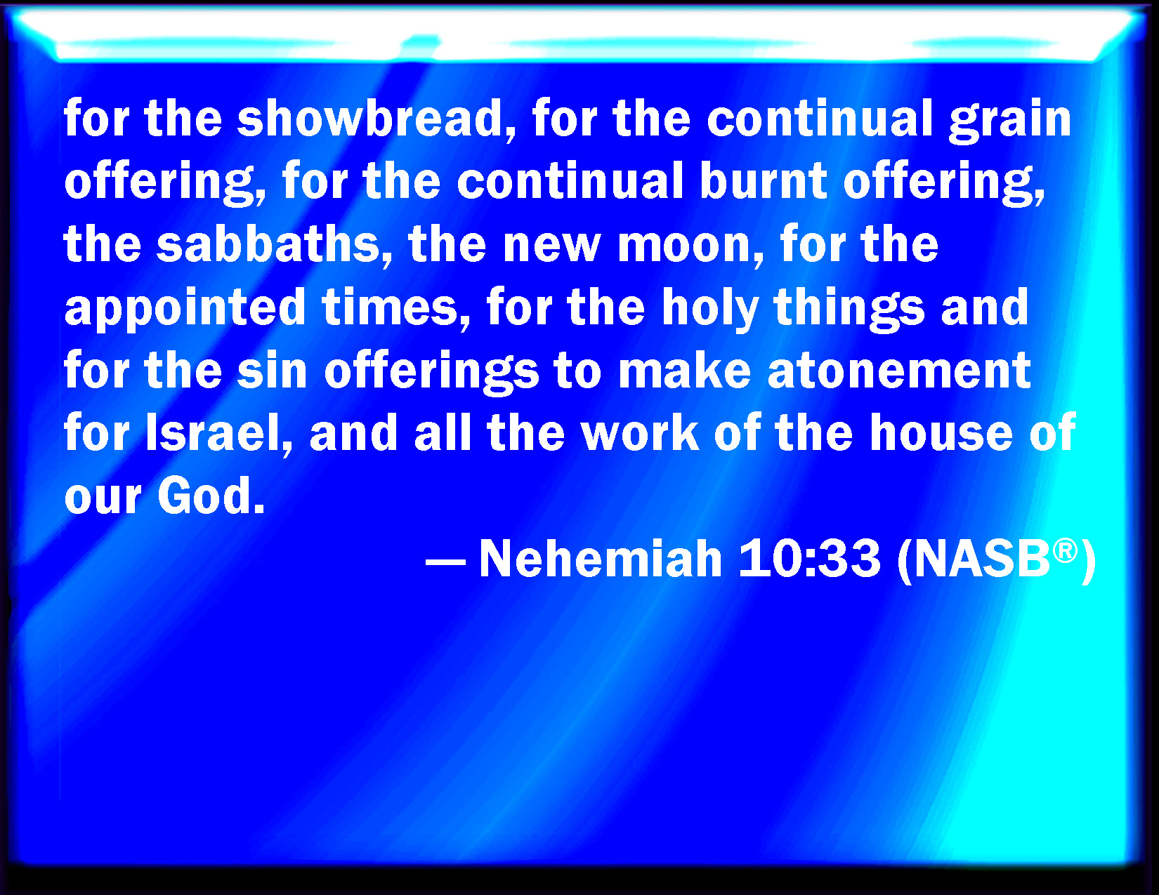 Bible Verse Slide Nehemiah 10:33 For the show bread, and for the continual meat offering, and for the continual burnt offering, of the sabbaths, of the new moons, for the set feasts, and for the holy things, and for the sin offerings to make an atonement for Israel, and for all the work of the house of our God. KJV: For the shewbread, and for the continual meat offering, and for the continual burnt offering, of the sabbaths, of the new moons, for the set feasts, and for the holy things, and for the sin offerings to make an atonement for Israel, and for all the work of the house of our God. DRB: For the leaves of proposition, and for the continual sacrifice, and for a continual holocaust on the sabbaths, on the new moons, on the set feasts, and for the holy things, and for the sin offering: that atonement might be made for Israel, and for every use of the house of our God. DBT: for the bread to be set in rows, and for the continual oblation, and for the continual burnt-offering, for that of the sabbaths and of the new moons, for the set feasts and for the holy things, and for the sin-offerings to make an atonement for Israel, and for all the work of the house of our God. ERV: for the shewbread, and for the continual meal offering, and for the continual burnt offering, of the sabbaths, of the new moons, for the set feasts, and for the holy things, and for the sin offerings to make atonement for Israel, and for all the work of the house of our God. WBT: For the show-bread, and for the continual meat-offering, and for the continual burnt-offering, of the sabbaths, of the new moons, for the set feasts, and for the holy things, and for the sin-offerings to make an atonement for Israel, and for all the work of the house of our God. WEB: for the show bread, and for the continual meal offering, and for the continual burnt offering, for the Sabbaths, for the new moons, for the set feasts, and for the holy things, and for the sin offerings to make atonement for Israel, and for all the work of the house of our God. YLT: for bread of the arrangement, and the continual present, and the continual burnt-offering of the sabbaths, of the new moons, for appointed seasons, and for holy things, and for sin-offerings, to make atonement for Israel, even all the work of the house of our God.Links Nehemiah 10:33 NIV • Nehemiah 10:33 NLT • Nehemiah 10:33 ESV • Nehemiah 10:33 NASB • Nehemiah 10:33 KJV • Nehemiah 10:33 Interlinear • Nehemiah 10:33 Commentaries • Nehemiah 10:33 Parallel Texts • Nehemiah 10:33 Bible Apps • Nehemiah 10:33 Parallel • Bible Hub |