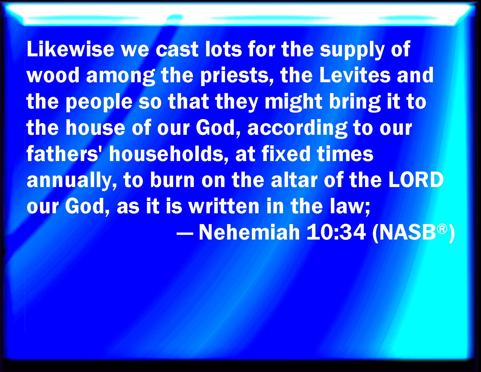 Bible Verse Slide Nehemiah 10:34 And we cast the lots among the priests, the Levites, and the people, for the wood offering, to bring it into the house of our God, after the houses of our fathers, at times appointed year by year, to burn on the altar of the LORD our God, as it is written in the law: KJV: And we cast the lots among the priests, the Levites, and the people, for the wood offering, to bring it into the house of our God, after the houses of our fathers, at times appointed year by year, to burn upon the altar of the LORD our God, as it is written in the law: DRB: And we cast lots among the priests, and the Levites, and the people for the offering of wood, that it might be brought into the house of our God by the houses of our fathers at set times, from year to year: to burn upon the altar of the Lord our God, as it is written in the law of Moses : DBT: And we cast the lots among the priests, the Levites, and the people, for the wood-offering, to bring it into the house of our God, according to our fathers' houses, at times appointed year by year, to burn upon the altar of Jehovah our God, as it is written in the law; ERV: And we cast lots, the priests, the Levites, and the people, for the wood offering, to bring it into the house of our God, according to our fathers' houses, at times appointed, year by year, to burn upon the altar of the LORD our God, as it is written in the law: WBT: And we cast the lots among the priests, the Levites, and the people, for the wood-offering, to bring it into the house of our God, after the houses of our fathers, at times appointed year by year, to burn upon the altar of the LORD our God, as it is written in the law: WEB: We cast lots, the priests, the Levites, and the people, for the wood offering, to bring it into the house of our God, according to our fathers' houses, at times appointed, year by year, to burn on the altar of Yahweh our God, as it is written in the law; YLT: And the lots we have caused to fall for the offering of wood, among the priests, the Levites, and the people, to bring in to the house of our God, by the house of our fathers, at times appointed, year by year, to burn on the altar of Jehovah our God, as it is written in the law,Links Nehemiah 10:34 NIV • Nehemiah 10:34 NLT • Nehemiah 10:34 ESV • Nehemiah 10:34 NASB • Nehemiah 10:34 KJV • Nehemiah 10:34 Interlinear • Nehemiah 10:34 Commentaries • Nehemiah 10:34 Parallel Texts • Nehemiah 10:34 Bible Apps • Nehemiah 10:34 Parallel • Bible Hub |