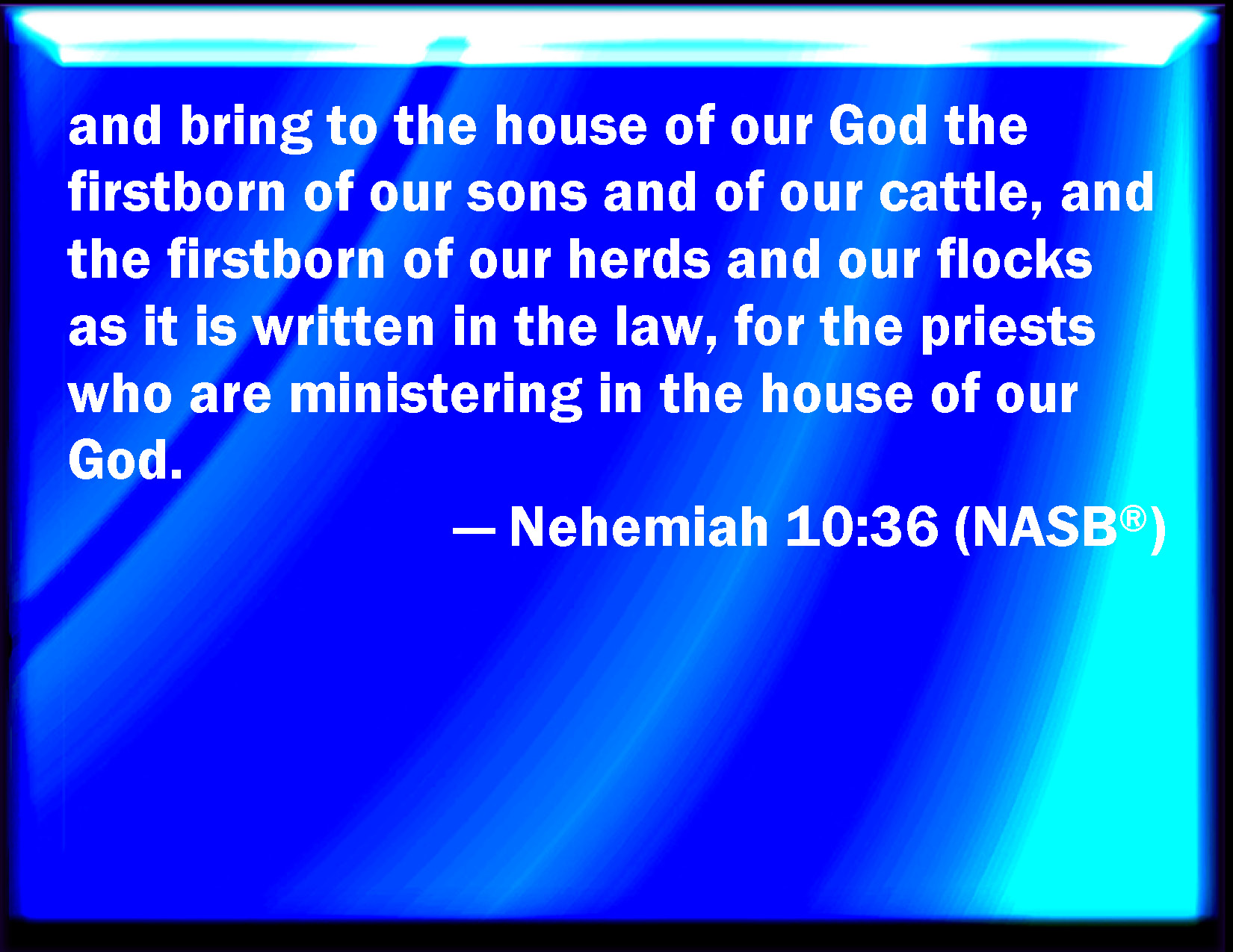 Bible Verse Slide Nehemiah 10:36 Also the firstborn of our sons, and of our cattle, as it is written in the law, and the firstborn of our herds and of our flocks, to bring to the house of our God, to the priests that minister in the house of our God: KJV: Also the firstborn of our sons, and of our cattle, as it is written in the law, and the firstlings of our herds and of our flocks, to bring to the house of our God, unto the priests that minister in the house of our God: DRB: And the firstborn of our sons, and of our cattle, as it is written in the law, and the firstlings of our oxen, and of our sheep, to be offered in the house of our God, to the priests who minister in the house of our God. DBT: and the firstborn of our sons and of our cattle, as it is written in the law; and to bring the firstlings of our herds and of our flocks to the house of our God, to the priests that minister in the house of our God; ERV: also the firstborn of our sons, and of our cattle, as it is written in the law, and the firstlings of our herds and of our flocks, to bring to the house of our God, unto the priests that minister in the house of our God: WBT: Also the first-born of our sons, and of our cattle, as it is written in the law, and the firstlings of our herds and of our flocks, to bring to the house of our God, to the priests that minister in the house of our God: WEB: also the firstborn of our sons, and of our livestock, as it is written in the law, and the firstborn of our herds and of our flocks, to bring to the house of our God, to the priests who minister in the house of our God; YLT: and the firstlings of our sons, and of our cattle, as it is written in the law, and the firstlings of our herds and our flocks, to bring in to the house of our God, to the priests who are ministering in the house of our God.Links Nehemiah 10:36 NIV • Nehemiah 10:36 NLT • Nehemiah 10:36 ESV • Nehemiah 10:36 NASB • Nehemiah 10:36 KJV • Nehemiah 10:36 Interlinear • Nehemiah 10:36 Commentaries • Nehemiah 10:36 Parallel Texts • Nehemiah 10:36 Bible Apps • Nehemiah 10:36 Parallel • Bible Hub |