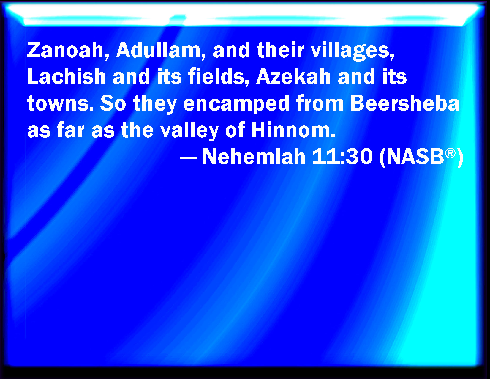 Bible Verse Slide Nehemiah 11:30 Zanoah, Adullam, and in their villages, at Lachish, and the fields thereof, at Azekah, and in the villages thereof. And they dwelled from Beersheba to the valley of Hinnom. KJV: Zanoah, Adullam, and in their villages, at Lachish, and the fields thereof, at Azekah, and in the villages thereof. And they dwelt from Beersheba unto the valley of Hinnom. DRB: Zanoa, Odollam, and in their villages, at Lachis and its dependencies, and at Azeca and the villages thereof. And they dwelt from Bersabee unto the valley of Ennom. DBT: Zanoah, Adullam, and their hamlets, in Lachish and its fields, in Azekah and its dependent villages: and they encamped from Beer-sheba unto the valley of Hinnom. ERV: Zanoah, Adullam, and their villages, Lachish and the fields thereof, Azekah and the towns thereof. So they encamped from Beer-sheba unto the valley of Hinnom. WBT: Zanoah, Adullam, and in their villages, at Lachish, and its fields, at Azekah, and in its villages. And they dwelt from Beer-sheba to the valley of Hinnom. WEB: Zanoah, Adullam, and their villages, Lachish and its fields, Azekah and its towns. So they encamped from Beersheba to the valley of Hinnom. YLT: Zanoah, Adullam, and their villages, Lachish and its fields, Azekah and its small towns; and they encamp from Beer-Sheba unto the valley of Hinnom.Links Nehemiah 11:30 NIV • Nehemiah 11:30 NLT • Nehemiah 11:30 ESV • Nehemiah 11:30 NASB • Nehemiah 11:30 KJV • Nehemiah 11:30 Interlinear • Nehemiah 11:30 Commentaries • Nehemiah 11:30 Parallel Texts • Nehemiah 11:30 Bible Apps • Nehemiah 11:30 Parallel • Bible Hub |
