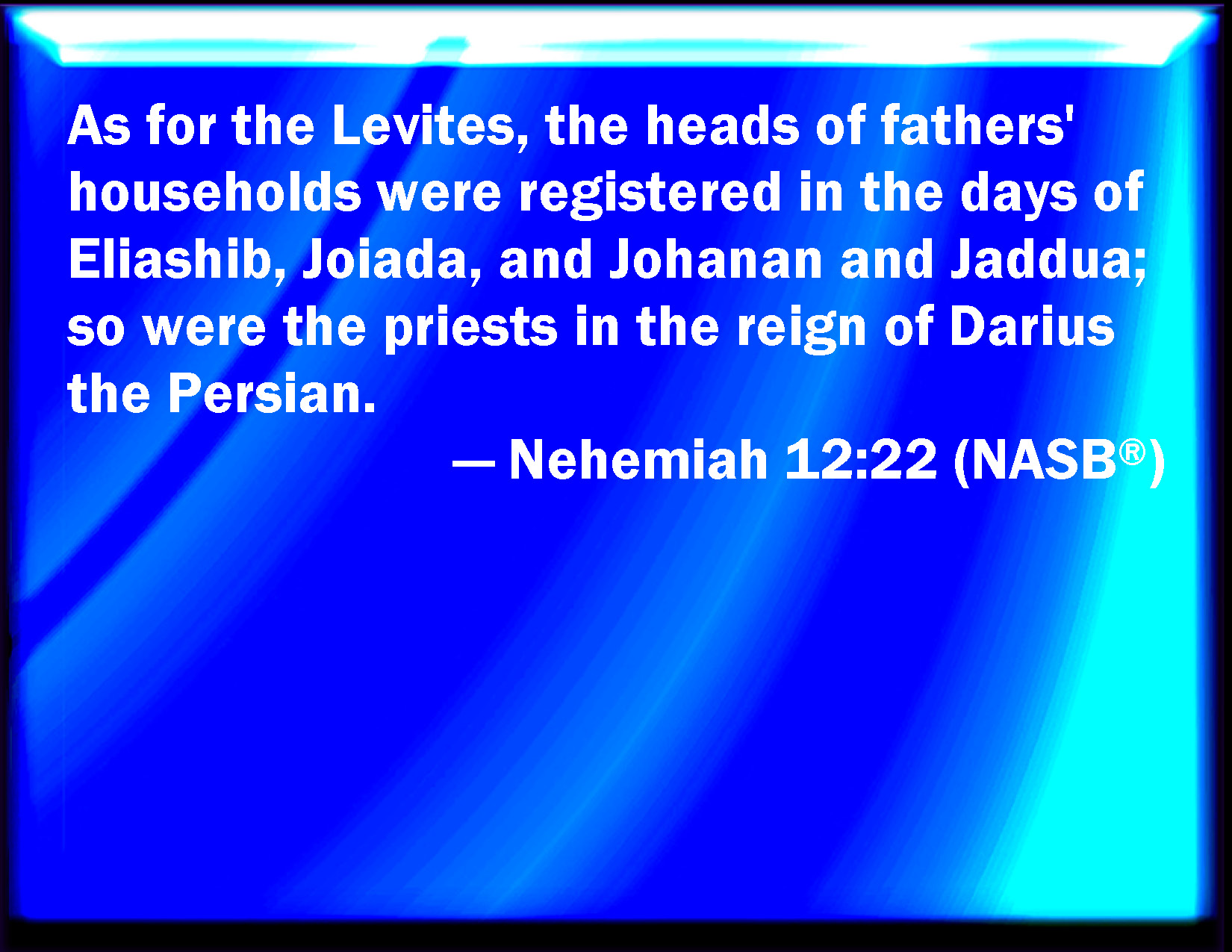 Bible Verse Slide Nehemiah 12:22 The Levites in the days of Eliashib, Joiada, and Johanan, and Jaddua, were recorded chief of the fathers: also the priests, to the reign of Darius the Persian. KJV: The Levites in the days of Eliashib, Joiada, and Johanan, and Jaddua, were recorded chief of the fathers: also the priests, to the reign of Darius the Persian. DRB: The Levites the chiefs of the families in the days of Eliasib, and Joiada, and Johanan, and Jeddoa, were recorded, and the priests in the reign of Darius the Persian. DBT: of the Levites, the chief fathers were recorded in the days of Eliashib, Joiada, and Johanan, and Jaddua, and the priests, until the reign of Darius the Persian. ERV: The Levites in the days of Eliashib, Joiada, and Johanan, and Jaddua, were recorded heads of fathers' houses: also the priests, in the reign of Darius the Persian. WBT: The Levites in the days of Eliashib, Joiada, and Johanan, and Jaddua, were recorded chief of the fathers: also the priests, to the reign of Darius the Persian. WEB: As for the Levites, in the days of Eliashib, Joiada, and Johanan, and Jaddua, there were recorded the heads of fathers' [houses]; also the priests, in the reign of Darius the Persian. YLT: The Levites, in the days of Eliashib, Joiada, and Johanan, and Jaddua, are written, heads of fathers, and of the priests, in the kingdom of Darius the Persian.Links Nehemiah 12:22 NIV • Nehemiah 12:22 NLT • Nehemiah 12:22 ESV • Nehemiah 12:22 NASB • Nehemiah 12:22 KJV • Nehemiah 12:22 Interlinear • Nehemiah 12:22 Commentaries • Nehemiah 12:22 Parallel Texts • Nehemiah 12:22 Bible Apps • Nehemiah 12:22 Parallel • Bible Hub |