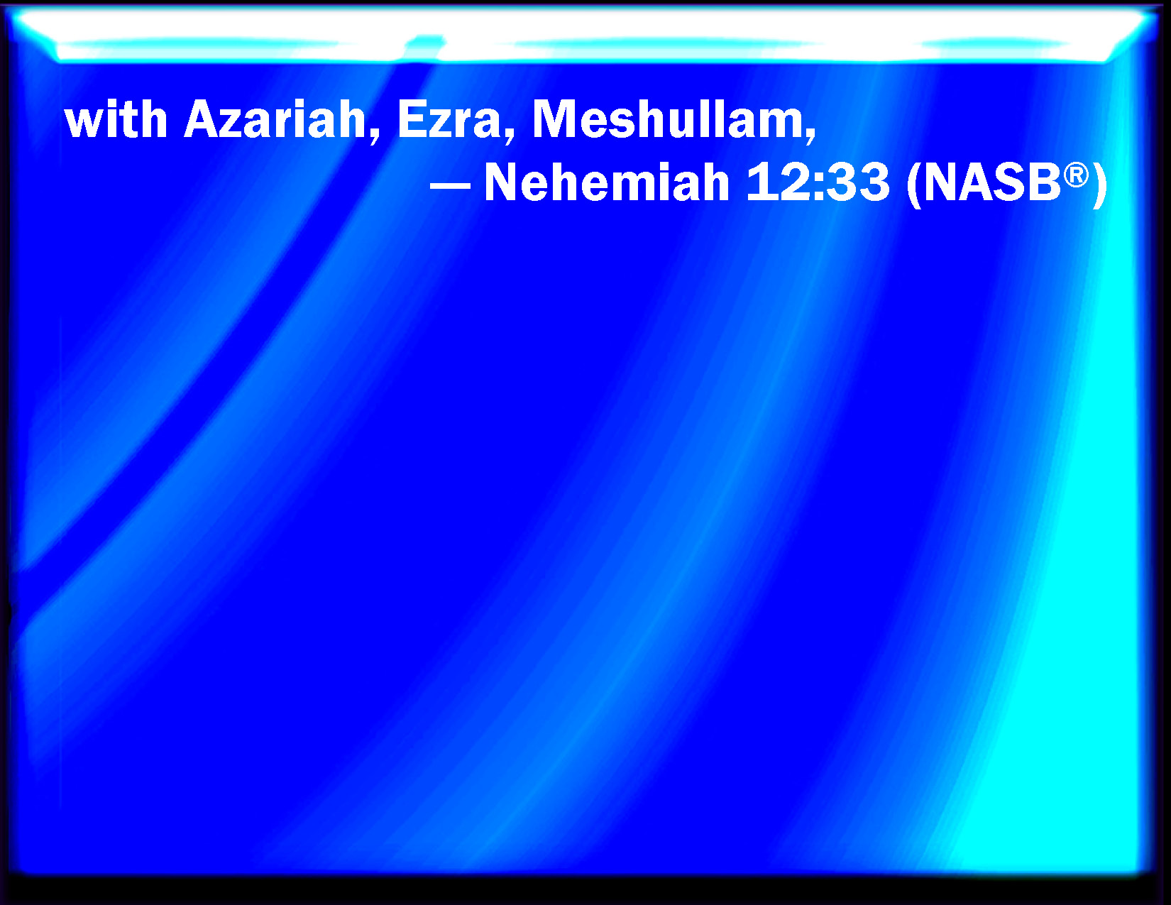 Bible Verse Slide Nehemiah 12:33 And Azariah, Ezra, and Meshullam, KJV: And Azariah, Ezra, and Meshullam, DRB: And Azarias, Esdras, and Mosollam, DBT: and Azariah, Ezra, and Meshullam, ERV: and Azariah, Ezra, and Meshullam, WBT: And Azariah, Ezra, and Meshullam, WEB: and Azariah, Ezra, and Meshullam, YLT: and Azariah, Ezra, and Meshullam,Links Nehemiah 12:33 NIV • Nehemiah 12:33 NLT • Nehemiah 12:33 ESV • Nehemiah 12:33 NASB • Nehemiah 12:33 KJV • Nehemiah 12:33 Interlinear • Nehemiah 12:33 Commentaries • Nehemiah 12:33 Parallel Texts • Nehemiah 12:33 Bible Apps • Nehemiah 12:33 Parallel • Bible Hub |