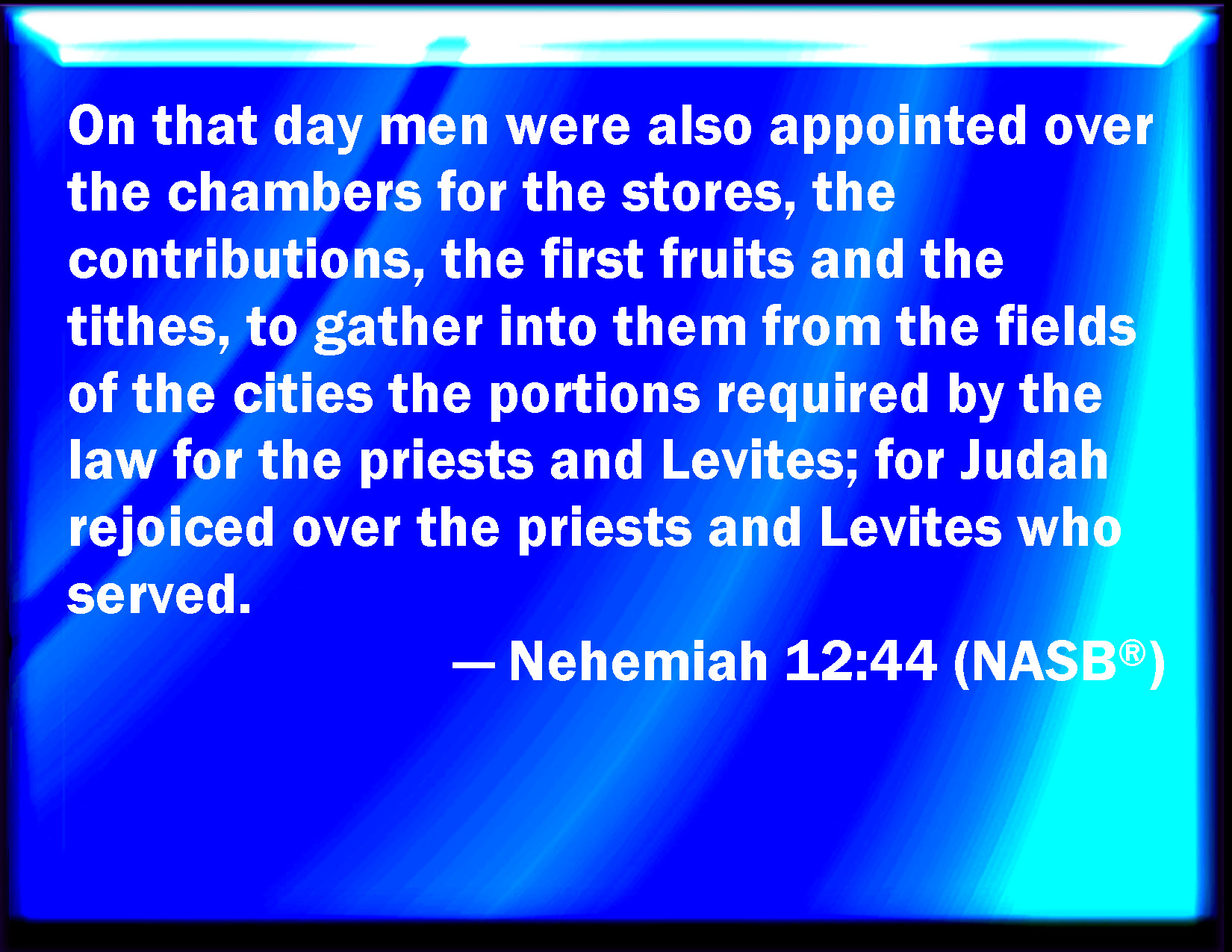 Bible Verse Slide Nehemiah 12:44 And at that time were some appointed over the chambers for the treasures, for the offerings, for the first fruits, and for the tithes, to gather into them out of the fields of the cities the portions of the law for the priests and Levites: for Judah rejoiced for the priests and for the Levites that waited. KJV: And at that time were some appointed over the chambers for the treasures, for the offerings, for the firstfruits, and for the tithes, to gather into them out of the fields of the cities the portions of the law for the priests and Levites: for Judah rejoiced for the priests and for the Levites that waited. DRB: They appointed also in that day men over the storehouses of the treasure, for the libations, and for the firstfruits, and for the tithes, that the rulers of the city might bring them in by them in honour of thanksgiving, for the priests and Levites: for Juda was joyful in the priests and Levites that assisted. DBT: And at that time men were appointed over the chambers of the treasures for the heave-offerings, for the first-fruits, and for the tithes, to gather into them, out of the fields of the cities, the portions assigned by the law for the priests and the Levites; for Judah rejoiced over the priests, and over the Levites that waited. ERV: And on that day were men appointed over the chambers for the treasures, for the heave offerings, for the firstfruits, and for the tithes, to gather into them, according to the fields of the cities, the portions appointed by the law for the priests and Levites: for Judah rejoiced for the priests and for the Levites that waited. WBT: And at that time were some appointed over the chambers for the treasures, for the offerings, for the first-fruits, and for the tithes, to gather into them out of the fields of the cities the portions of the law for the priests and Levites: for Judah rejoiced for the priests and for the Levites that waited. WEB: On that day were men appointed over the rooms for the treasures, for the wave offerings, for the first fruits, and for the tithes, to gather into them, according to the fields of the cities, the portions appointed by the law for the priests and Levites: for Judah rejoiced for the priests and for the Levites who waited. YLT: And certain are appointed on that day over the chambers for treasures, for heave-offerings, for first-fruits, and for tithes, to gather into them out of the fields of the cities the portions of the law for priests, and for Levites, for the joy of Judah is over the priests, and over the Levites, who are standing up.Links Nehemiah 12:44 NIV • Nehemiah 12:44 NLT • Nehemiah 12:44 ESV • Nehemiah 12:44 NASB • Nehemiah 12:44 KJV • Nehemiah 12:44 Interlinear • Nehemiah 12:44 Commentaries • Nehemiah 12:44 Parallel Texts • Nehemiah 12:44 Bible Apps • Nehemiah 12:44 Parallel • Bible Hub |