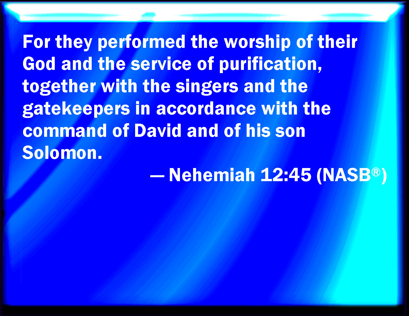 Bible Verse Slide Nehemiah 12:45 And both the singers and the porters kept the ward of their God, and the ward of the purification, according to the commandment of David, and of Solomon his son. KJV: And both the singers and the porters kept the ward of their God, and the ward of the purification, according to the commandment of David, and of Solomon his son. DRB: And they kept the watch of their God, and the observance of expiation, and the singing men, and the porters, according to the commandment of David, and of Solomon his son. DBT: And, with the singers and the doorkeepers, they kept the ward of their God, and the ward of the purification, according to the commandment of David and of Solomon his son. ERV: And they kept the ward of their God, and the ward of the purification, and so did the singers and the porters, according to the commandment of David, and of Solomon his son. WBT: And both the singers and the porters kept the ward of their God, and the ward of the purification, according to the commandment of David, and of Solomon his son. WEB: They performed the duty of their God, and the duty of the purification, and [so did] the singers and the porters, according to the commandment of David, and of Solomon his son. YLT: And the singers and the gatekeepers keep the charge of their God, even the charge of the cleansing — according to the command of David and Solomon his son,Links Nehemiah 12:45 NIV • Nehemiah 12:45 NLT • Nehemiah 12:45 ESV • Nehemiah 12:45 NASB • Nehemiah 12:45 KJV • Nehemiah 12:45 Interlinear • Nehemiah 12:45 Commentaries • Nehemiah 12:45 Parallel Texts • Nehemiah 12:45 Bible Apps • Nehemiah 12:45 Parallel • Bible Hub |