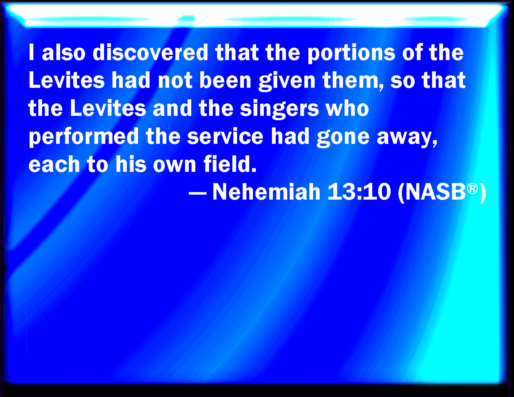 Bible Verse Slide Nehemiah 13:10 And I perceived that the portions of the Levites had not been given them: for the Levites and the singers, that did the work, were fled every one to his field. KJV: And I perceived that the portions of the Levites had not been given them: for the Levites and the singers, that did the work, were fled every one to his field. DRB: And I perceived that the portions of the Levites had not been given them: and that the Levites, and the singing men, and they that ministered were fled away every man to his own country: DBT: And I perceived that the portions of the Levites had not been given, and that the Levites and the singers that did the work had fled every one to his field. ERV: And I perceived that the portions of the Levites had not been given them; so that the Levites and the singers, that did the work, were fled every one to his field. WBT: And I perceived that the portions of the Levites had not been given them: for the Levites and the singers, that did the work, had fled every one to his field. WEB: I perceived that the portions of the Levites had not been given them; so that the Levites and the singers, who did the work, had fled everyone to his field. YLT: And I know that the portions of the Levites have not been given, and they flee each to his field — the Levites and the singers, doing the work.Links Nehemiah 13:10 NIV • Nehemiah 13:10 NLT • Nehemiah 13:10 ESV • Nehemiah 13:10 NASB • Nehemiah 13:10 KJV • Nehemiah 13:10 Interlinear • Nehemiah 13:10 Commentaries • Nehemiah 13:10 Parallel Texts • Nehemiah 13:10 Bible Apps • Nehemiah 13:10 Parallel • Bible Hub |