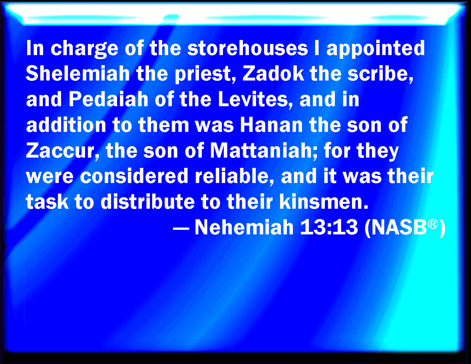 Bible Verse Slide Nehemiah 13:13 And I made treasurers over the treasuries, Shelemiah the priest, and Zadok the scribe, and of the Levites, Pedaiah: and next to them was Hanan the son of Zaccur, the son of Mattaniah: for they were counted faithful, and their office was to distribute to their brothers. KJV: And I made treasurers over the treasuries, Shelemiah the priest, and Zadok the scribe, and of the Levites, Pedaiah: and next to them was Hanan the son of Zaccur, the son of Mattaniah: for they were counted faithful, and their office was to distribute unto their brethren. DRB: And we set over the storehouses Selemias the priest, and Sadoc the scribe, and of the Levites Phadaia, and next to them Hanan the son of Zachur, the son of Mathania: for they were approved as faithful, and to them were committed the portions of their brethren. DBT: And I made storekeepers over the storehouses: Shelemiah the priest, and Zadok the scribe, and of the Levites, Pedaiah; and subordinate to them, Hanan the son of Zaccur, the son of Mattaniah; for they were esteemed faithful, and their office was to distribute to their brethren. ERV: And I made treasurers over the treasuries, Shelemiah the priest, and Zadok the scribe, and of the Levites, Pedaiah: and next to them was Hanan the son of Zaccur, the son of Mattaniah: for they were counted faithful, and their business was to distribute unto their brethren. WBT: And I made treasurers over the treasuries, Shelemiah the priest, and Zadok the scribe, and of the Levites, Pedaiah: and next to them was Hanan the son of Zaccur, the son of Mattaniah: for they were accounted faithful; and their office was to distribute to their brethren. WEB: I made treasurers over the treasuries, Shelemiah the priest, and Zadok the scribe, and of the Levites, Pedaiah: and next to them was Hanan the son of Zaccur, the son of Mattaniah; for they were counted faithful, and their business was to distribute to their brothers. YLT: And I appoint treasurers over the treasuries, Shelemiah the priest, and Zadok the scribe, and Pedaiah of the Levites; and by their hand is Hanan son of Zaccur, son of Mattaniah, for stedfast they have been reckoned, and on them it is to give a portion to their brethren.Links Nehemiah 13:13 NIV • Nehemiah 13:13 NLT • Nehemiah 13:13 ESV • Nehemiah 13:13 NASB • Nehemiah 13:13 KJV • Nehemiah 13:13 Interlinear • Nehemiah 13:13 Commentaries • Nehemiah 13:13 Parallel Texts • Nehemiah 13:13 Bible Apps • Nehemiah 13:13 Parallel • Bible Hub |
