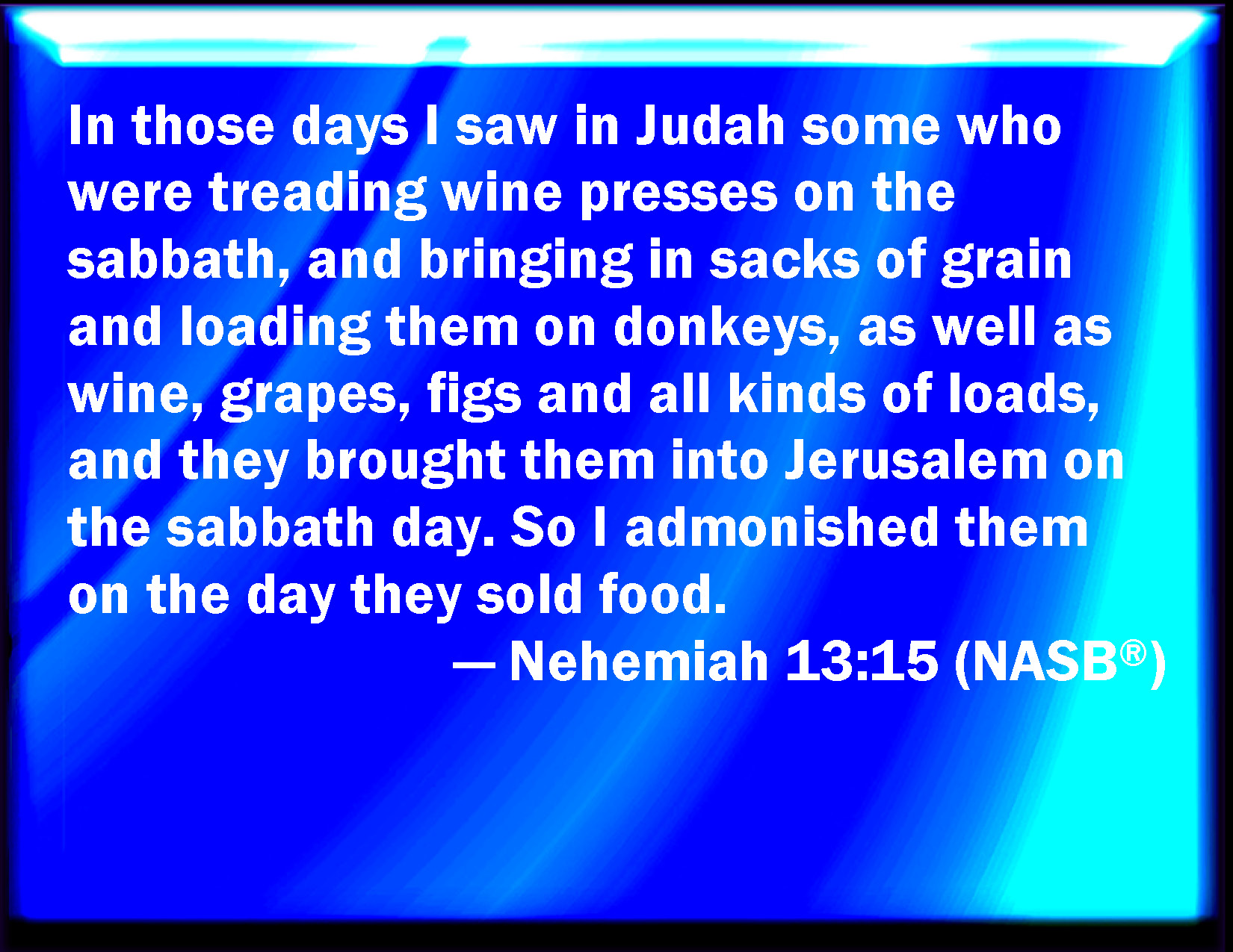 Bible Verse Slide Nehemiah 13:15 In those days saw I in Judah some treading wine presses on the sabbath, and bringing in sheaves, and lading asses; as also wine, grapes, and figs, and all manner of burdens, which they brought into Jerusalem on the sabbath day: and I testified against them in the day wherein they sold victuals. KJV: In those days saw I in Judah some treading wine presses on the sabbath, and bringing in sheaves, and lading asses; as also wine, grapes, and figs, and all manner of burdens, which they brought into Jerusalem on the sabbath day: and I testified against them in the day wherein they sold victuals. DRB: In those days I saw in Juda some treading the presses on the sabbath, and carrying sheaves, and lading asses with wine, and grapes, and figs, and all manner of burthens, and bringing them into Jerusalem on the sabbath day. And I charged them that they should sell on a day on which it was lawful to sell. DBT: In those days I saw in Judah some treading winepresses on the sabbath, and bringing in sheaves, and lading them on asses; as also wine, grapes and figs, and all manner of burdens; and they brought them into Jerusalem on the sabbath day; and I protested in the day on which they sold the victuals. ERV: In those days saw I in Judah some treading winepresses on the sabbath, and bringing in sheaves, and lading asses therewith; as also wine, grapes, and figs, and all manner of burdens, which they brought into Jerusalem on the sabbath day: and I testified against them in the day wherein they sold victuals. WBT: In those days I saw in Judah some treading wine presses on the sabbath, and bringing in sheaves, and lading asses; as also wine, grapes, and figs, and all manner of burdens, which they brought into Jerusalem on the sabbath day: and I testified against them in the day in which they sold provisions. WEB: In those days saw I in Judah some men treading winepresses on the Sabbath, and bringing in sheaves, and loading donkeys [therewith]; as also wine, grapes, and figs, and all kinds of burdens, which they brought into Jerusalem on the Sabbath day: and I testified [against them] in the day in which they sold food. YLT: In those days I have seen in Judah those treading wine-vats on sabbath, and bringing in the sheaves, and lading on the asses, and also, wine, grapes, and figs, and every burden, yea, they are bringing in to Jerusalem on the sabbath-day, and I testify in the day of their selling provision.Links Nehemiah 13:15 NIV • Nehemiah 13:15 NLT • Nehemiah 13:15 ESV • Nehemiah 13:15 NASB • Nehemiah 13:15 KJV • Nehemiah 13:15 Interlinear • Nehemiah 13:15 Commentaries • Nehemiah 13:15 Parallel Texts • Nehemiah 13:15 Bible Apps • Nehemiah 13:15 Parallel • Bible Hub |