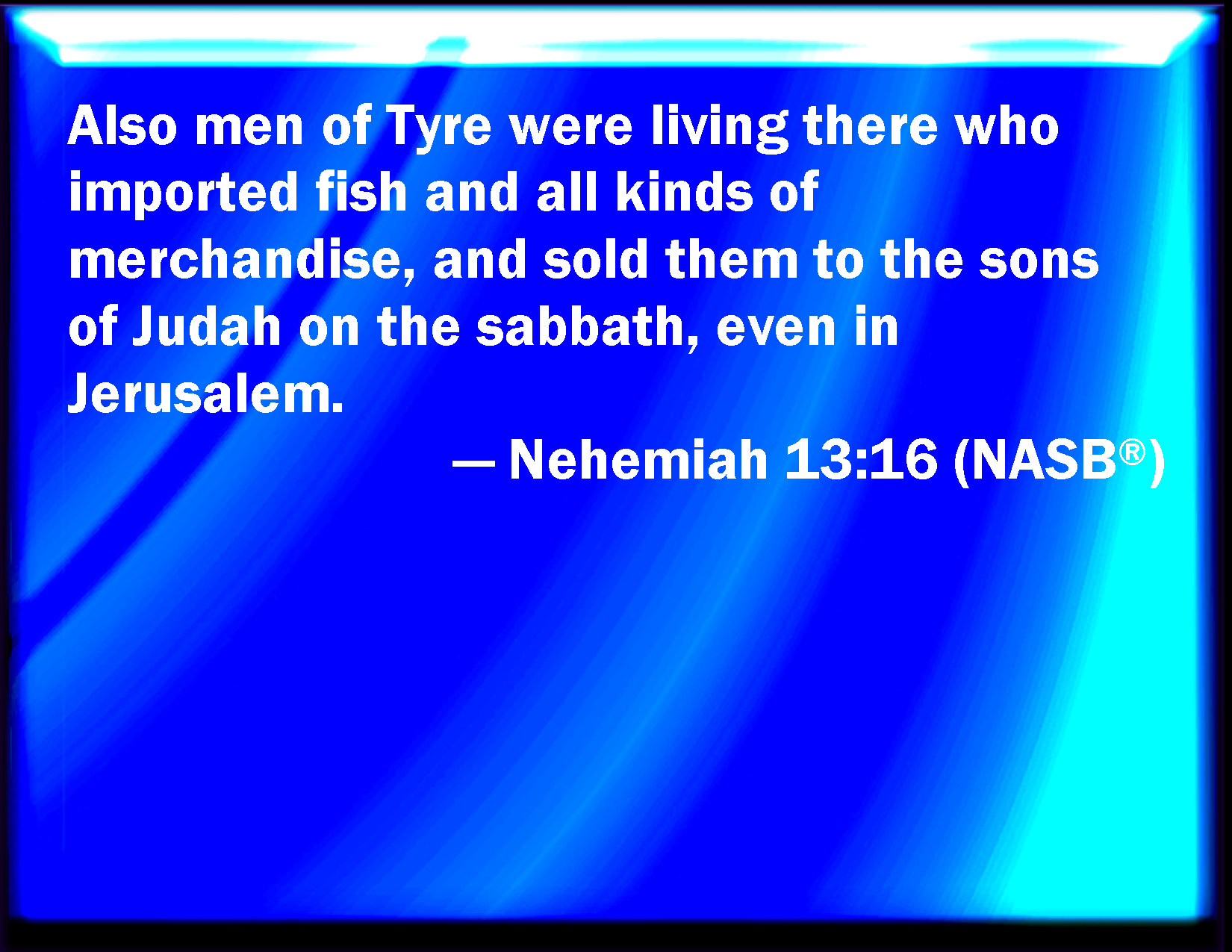 Bible Verse Slide Nehemiah 13:16 There dwelled men of Tyre also therein, which brought fish, and all manner of ware, and sold on the sabbath to the children of Judah, and in Jerusalem. KJV: There dwelt men of Tyre also therein, which brought fish, and all manner of ware, and sold on the sabbath unto the children of Judah, and in Jerusalem. DRB: Some Tyrians also dwelt there, who brought fish, and all manner of wares: and they sold them on the sabbaths to the children of Juda in Jerusalem. DBT: Men of Tyre also dwelt therein, who brought fish and all manner of ware, and sold it on the sabbath to the children of Judah, and in Jerusalem. ERV: There dwelt men of Tyre also therein, which brought in fish, and all manner of ware, and sold on the sabbath unto the children of Judah, and in Jerusalem. WBT: There dwelt men of Tyre also therein, who brought fish, and all manner of wares, and sold on the sabbath to the children of Judah, and in Jerusalem. WEB: There lived men of Tyre also therein, who brought in fish, and all kinds of wares, and sold on the Sabbath to the children of Judah, and in Jerusalem. YLT: And the Tyrians have dwelt in it, bringing in fish, and every ware, and selling on sabbath to the sons of Judah and in Jerusalem.Links Nehemiah 13:16 NIV • Nehemiah 13:16 NLT • Nehemiah 13:16 ESV • Nehemiah 13:16 NASB • Nehemiah 13:16 KJV • Nehemiah 13:16 Interlinear • Nehemiah 13:16 Commentaries • Nehemiah 13:16 Parallel Texts • Nehemiah 13:16 Bible Apps • Nehemiah 13:16 Parallel • Bible Hub |