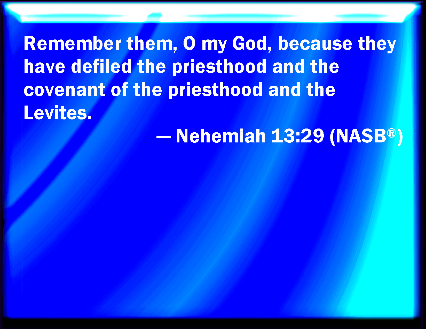 Bible Verse Slide Nehemiah 13:29 Remember them, O my God, because they have defiled the priesthood, and the covenant of the priesthood, and of the Levites. KJV: Remember them, O my God, because they have defiled the priesthood, and the covenant of the priesthood, and of the Levites. DRB: Remember them, O Lord my God, that defile the priesthood, and the law of priests and Levites. DBT: Remember them, my God, for they are polluters of the priesthood, and of the covenant of the priesthood and of the Levites! ERV: Remember them, O my God, because they have defiled the priesthood, and the covenant of the priesthood, and of the Levites. WBT: Remember them, O my God, because they have defiled the priesthood, and the covenant of the priesthood and of the Levites. WEB: Remember them, my God, because they have defiled the priesthood, and the covenant of the priesthood, and of the Levites. YLT: Be mindful of them, O my God, for the redeemed of the priesthood, and the covenant of the priesthood, and of the Levites.Links Nehemiah 13:29 NIV • Nehemiah 13:29 NLT • Nehemiah 13:29 ESV • Nehemiah 13:29 NASB • Nehemiah 13:29 KJV • Nehemiah 13:29 Interlinear • Nehemiah 13:29 Commentaries • Nehemiah 13:29 Parallel Texts • Nehemiah 13:29 Bible Apps • Nehemiah 13:29 Parallel • Bible Hub |