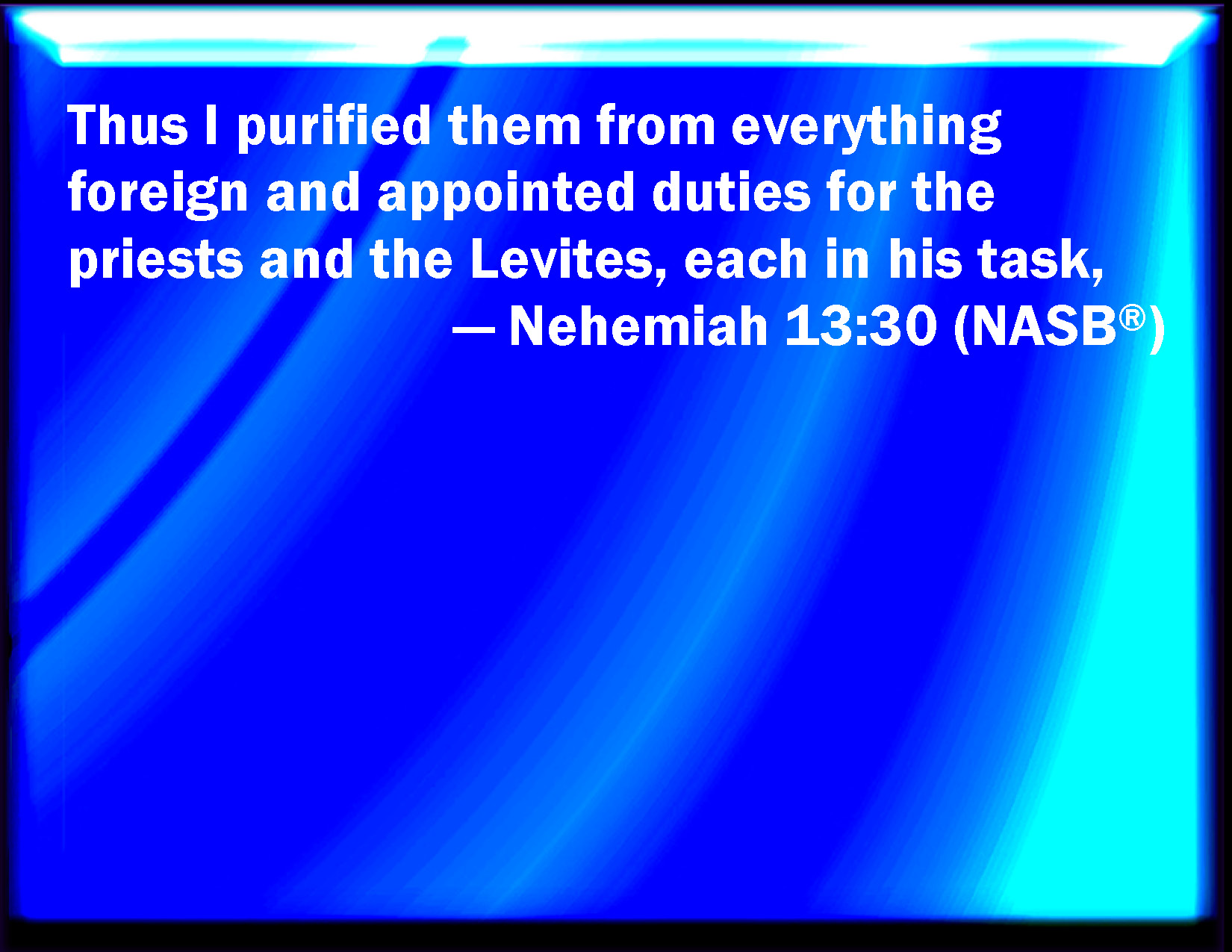 Bible Verse Slide Nehemiah 13:30 Thus cleansed I them from all strangers, and appointed the wards of the priests and the Levites, every one in his business; KJV: Thus cleansed I them from all strangers, and appointed the wards of the priests and the Levites, every one in his business; DRB: So I separated from them all strangers, and I appointed the courses of the priests and the Levites, every man in his ministry : DBT: And I purified them from all foreigners, and appointed the charges of the priests and the Levites, every one in his service; ERV: Thus cleansed I them from all strangers, and appointed wards for the priests and for the Levites, every one in his work; WBT: Thus I cleansed them from all strangers, and appointed the wards of the priests and the Levites, every one in his business; WEB: Thus I cleansed them from all foreigners, and appointed duties for the priests and for the Levites, everyone in his work; YLT: And I have cleansed them from every stranger, and appoint charges to priests and to Levites, each in his work,Links Nehemiah 13:30 NIV • Nehemiah 13:30 NLT • Nehemiah 13:30 ESV • Nehemiah 13:30 NASB • Nehemiah 13:30 KJV • Nehemiah 13:30 Interlinear • Nehemiah 13:30 Commentaries • Nehemiah 13:30 Parallel Texts • Nehemiah 13:30 Bible Apps • Nehemiah 13:30 Parallel • Bible Hub |