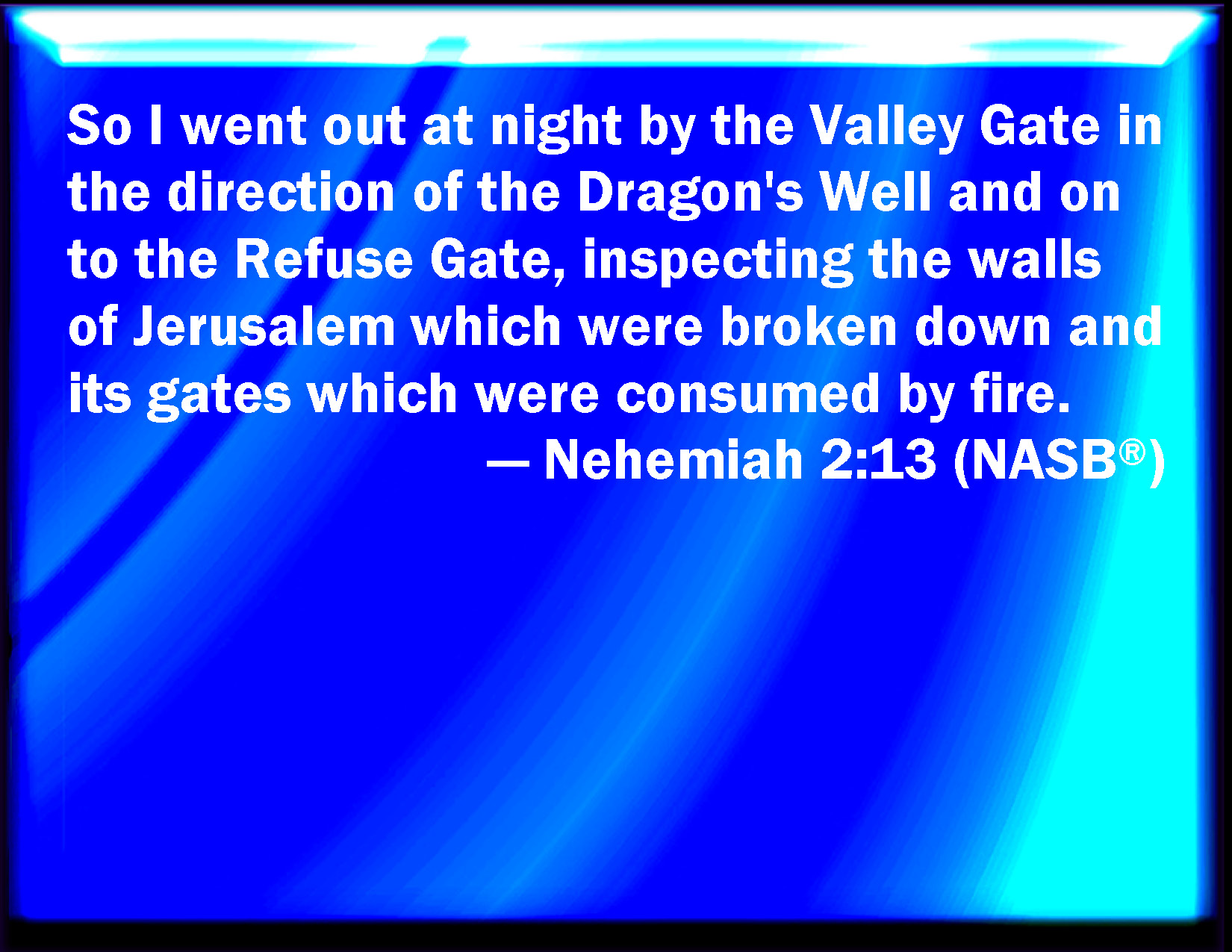 Bible Verse Slide Nehemiah 2:13 And I went out by night by the gate of the valley, even before the dragon well, and to the dung port, and viewed the walls of Jerusalem, which were broken down, and the gates thereof were consumed with fire. KJV: And I went out by night by the gate of the valley, even before the dragon well, and to the dung port, and viewed the walls of Jerusalem, which were broken down, and the gates thereof were consumed with fire. DRB: And I went out by night by the gate of the valley, and before the dragon fountain, and to the dung gate, and I viewed the wall of Jerusalem which was broken down, and the gates thereof which were consumed with fire. DBT: And I went out by night by the valley-gate, even toward the jackal-fountain, and to the dung-gate; and I viewed the walls of Jerusalem, which were in ruins, and its gates were consumed with fire. ERV: And I went out by night by the valley gate, even toward the dragon's well, and to the dung gate, and viewed the walls of Jerusalem, which were broken down, and the gates thereof were consumed with fire. WBT: And I went out by night by the gate of the valley, even before the dragon-well, and to the dung-port, and viewed the walls of Jerusalem, which were broken down, and their gates were consumed with fire. WEB: I went out by night by the valley gate, even toward the jackal's well, and to the dung gate, and viewed the walls of Jerusalem, which were broken down, and its gates were consumed with fire. YLT: And I go out through the gate of the valley by night, and unto the front of the fountain of the dragon, and unto the gate of the dunghill, and I am measuring about the walls of Jerusalem, that are broken down, and its gates consumed with fire.Links Nehemiah 2:13 NIV • Nehemiah 2:13 NLT • Nehemiah 2:13 ESV • Nehemiah 2:13 NASB • Nehemiah 2:13 KJV • Nehemiah 2:13 Interlinear • Nehemiah 2:13 Commentaries • Nehemiah 2:13 Parallel Texts • Nehemiah 2:13 Bible Apps • Nehemiah 2:13 Parallel • Bible Hub |