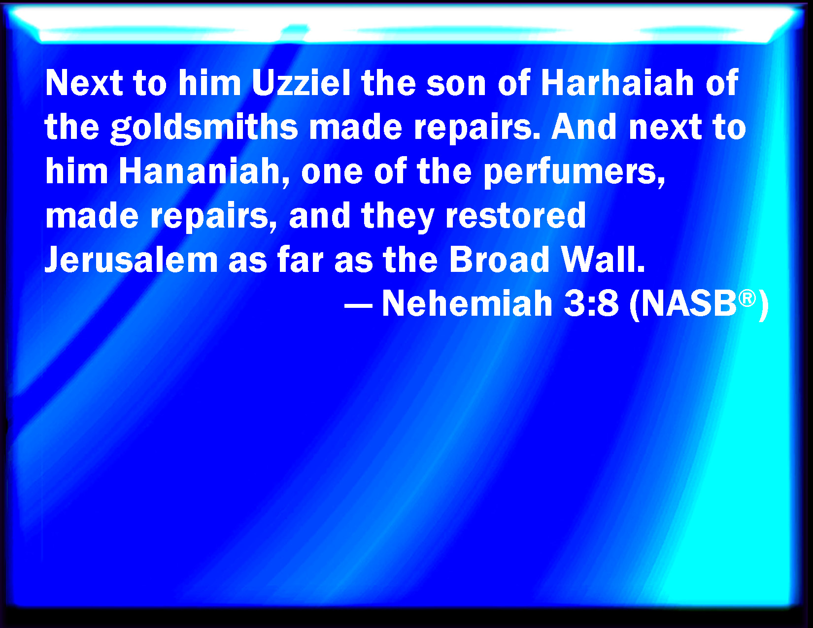 Bible Verse Slide Nehemiah 3:8 Next to him repaired Uzziel the son of Harhaiah, of the goldsmiths. Next to him also repaired Hananiah the son of one of the apothecaries, and they fortified Jerusalem to the broad wall. KJV: Next unto him repaired Uzziel the son of Harhaiah, of the goldsmiths. Next unto him also repaired Hananiah the son of one of the apothecaries, and they fortified Jerusalem unto the broad wall. DRB: And next to him built Eziel the son of Araia the goldsmith: and next to him built Ananias the son of the perfumer: and they left Jerusalem unto the wall of the broad street. DBT: Next to them repaired Uzziel the son of Harhaiah, of the goldsmiths; and next to him repaired Hananiah of the perfumers, and they left Jerusalem in its state as far as the broad wall. ERV: Next unto him repaired Uzziel the son of Harhaiah, goldsmiths. And next unto him repaired Hananiah one of the apothecaries, and they fortified Jerusalem even unto the broad wall. WBT: Next to him repaired Uzziel the son of Harhaiah, of the goldsmiths. Next to him also repaired Hananiah the son of one of the apothecaries, and they fortified Jerusalem to the broad wall. WEB: Next to him repaired Uzziel the son of Harhaiah, goldsmiths. Next to him repaired Hananiah one of the perfumers, and they fortified Jerusalem even to the broad wall. YLT: By his hand hath Uzziel son of Harhaiah of the refiners strengthened; and by his hand hath Hananiah son of one of the compounders strengthened; and they leave Jerusalem unto the broad wall.Links Nehemiah 3:8 NIV • Nehemiah 3:8 NLT • Nehemiah 3:8 ESV • Nehemiah 3:8 NASB • Nehemiah 3:8 KJV • Nehemiah 3:8 Interlinear • Nehemiah 3:8 Commentaries • Nehemiah 3:8 Parallel Texts • Nehemiah 3:8 Bible Apps • Nehemiah 3:8 Parallel • Bible Hub |