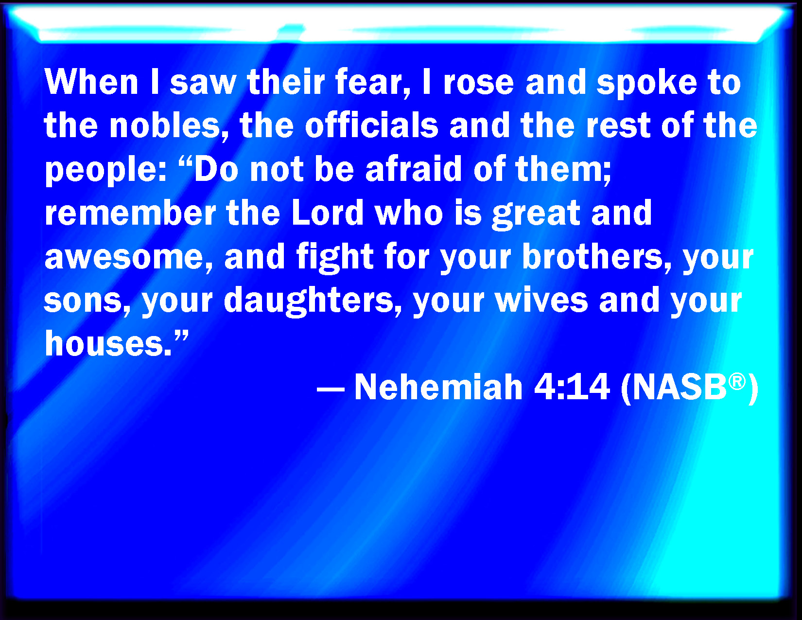Bible Verse Slide Nehemiah 4:14 And I looked, and rose up, and said to the nobles, and to the rulers, and to the rest of the people, Be not you afraid of them: remember the LORD, which is great and terrible, and fight for your brothers, your sons, and your daughters, your wives, and your houses. KJV: And I looked, and rose up, and said unto the nobles, and to the rulers, and to the rest of the people, Be not ye afraid of them: remember the Lord, which is great and terrible, and fight for your brethren, your sons, and your daughters, your wives, and your houses. DRB: And I looked and rose up: and I said to the chief men and the magistrates, and to the rest of the common people: be not afraid of them. Remember the Lord who is great and terrible, and fight for your brethren, your sons, and your daughters, and your wives, and your houses. DBT: And I looked, and rose up, and said to the nobles, and to the rulers, and to the rest of the people, Be not afraid of them: remember the Lord who is great and terrible, and fight for your brethren, your sons and your daughters, your wives and your houses. ERV: And I looked, and rose up, and said unto the nobles, and to the rulers, and to the rest of the people, Be not ye afraid of them: remember the Lord, which is great and terrible, and fight for your brethren, your sons and your daughters, your wives and your houses. WBT: And I looked, and arose, and said to the nobles, and to the rulers, and to the rest of the people, Be ye not afraid of them: remember the Lord who is great and terrible, and fight for your brethren, your sons, and your daughters, your wives, and your houses. WEB: I looked, and rose up, and said to the nobles, and to the rulers, and to the rest of the people, "Don't be afraid of them! Remember the Lord, who is great and awesome, and fight for your brothers, your sons, and your daughters, your wives, and your houses." YLT: And I see, and rise up, and say unto the freemen, and unto the prefects, and unto the rest of the people, 'Be not afraid of them; the Lord, the great and the fearful, remember ye, and fight for your brethren, your sons, and your daughters, your wives, and your houses.'Links Nehemiah 4:14 NIV • Nehemiah 4:14 NLT • Nehemiah 4:14 ESV • Nehemiah 4:14 NASB • Nehemiah 4:14 KJV • Nehemiah 4:14 Interlinear • Nehemiah 4:14 Commentaries • Nehemiah 4:14 Parallel Texts • Nehemiah 4:14 Bible Apps • Nehemiah 4:14 Parallel • Bible Hub |