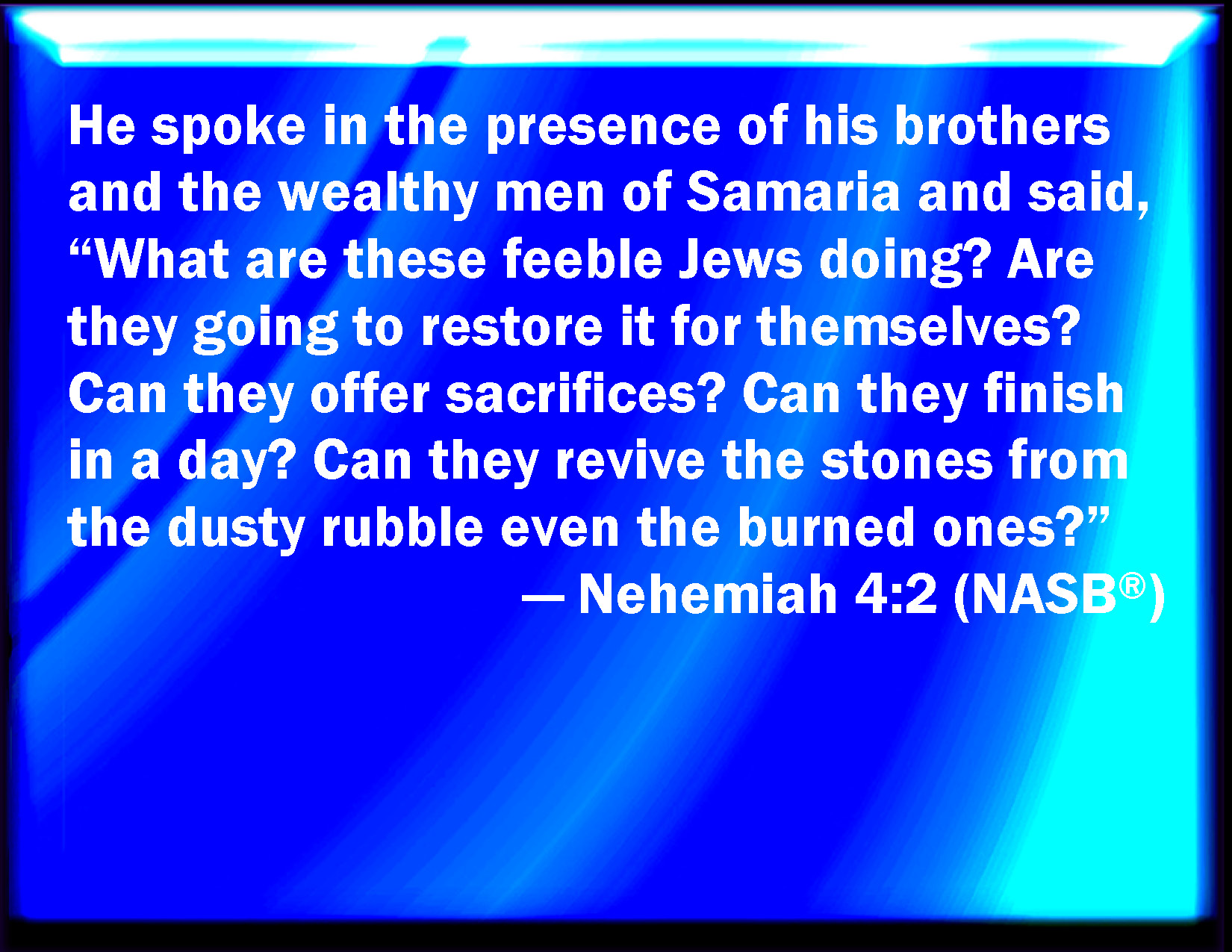 And he spoke before his brethren, and the army of Samaria, and said, What do these feeble Jews? will they fortify themselves? will they sacrifice? will they make an end in a day? will they revive the stones out of the heaps of the rubbish which are burned?