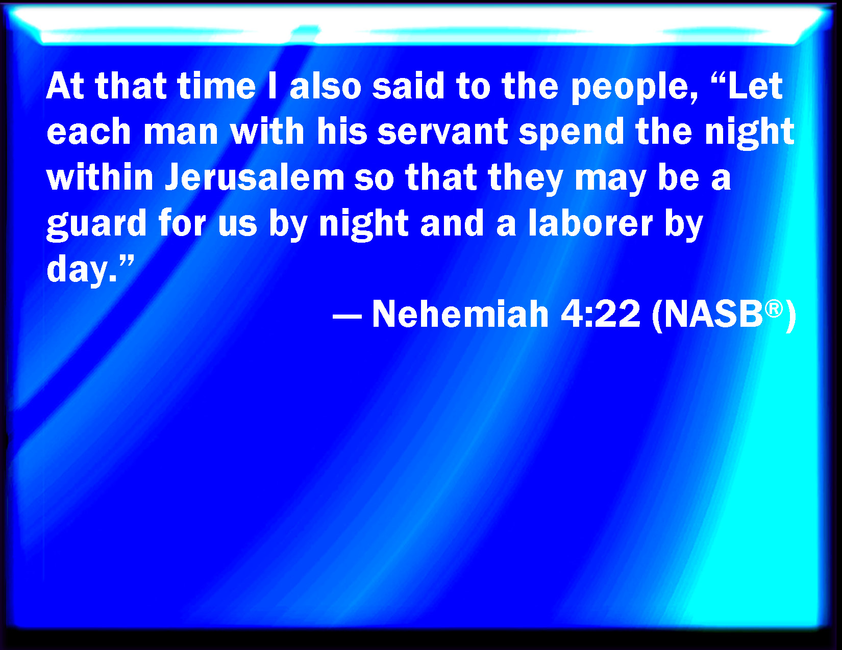 Bible Verse Slide Nehemiah 4:22 Likewise at the same time said I to the people, Let every one with his servant lodge within Jerusalem, that in the night they may be a guard to us, and labor on the day. KJV: Likewise at the same time said I unto the people, Let every one with his servant lodge within Jerusalem, that in the night they may be a guard to us, and labour on the day. DRB: At that time also I said to the people: Let every one with his servant stay in the midst of Jerusalem, and let us take our turns in the night, and by day, to work. DBT: Likewise at the same time I said to the people, Let every one with his servant lodge within Jerusalem, that in the night they may be a guard to us, and be for labour in the day. ERV: Likewise at the same time said I unto the people, Let every one with his servant lodge within Jerusalem, that in the night they may be a guard to us, and may labour in the day. WBT: Likewise at the same time said I to the people, Let every one with his servant lodge within Jerusalem, that in the night they may be a guard to us, and labor in the day. WEB: Likewise at the same time said I to the people, "Let everyone with his servant lodge within Jerusalem, that in the night they may be a guard to us, and may labor in the day." YLT: Also, at that time I said to the people, 'Let each with his servant lodge in the midst of Jerusalem, and they have been to us by night a guard, and by day for the work:'Links Nehemiah 4:22 NIV • Nehemiah 4:22 NLT • Nehemiah 4:22 ESV • Nehemiah 4:22 NASB • Nehemiah 4:22 KJV • Nehemiah 4:22 Interlinear • Nehemiah 4:22 Commentaries • Nehemiah 4:22 Parallel Texts • Nehemiah 4:22 Bible Apps • Nehemiah 4:22 Parallel • Bible Hub |