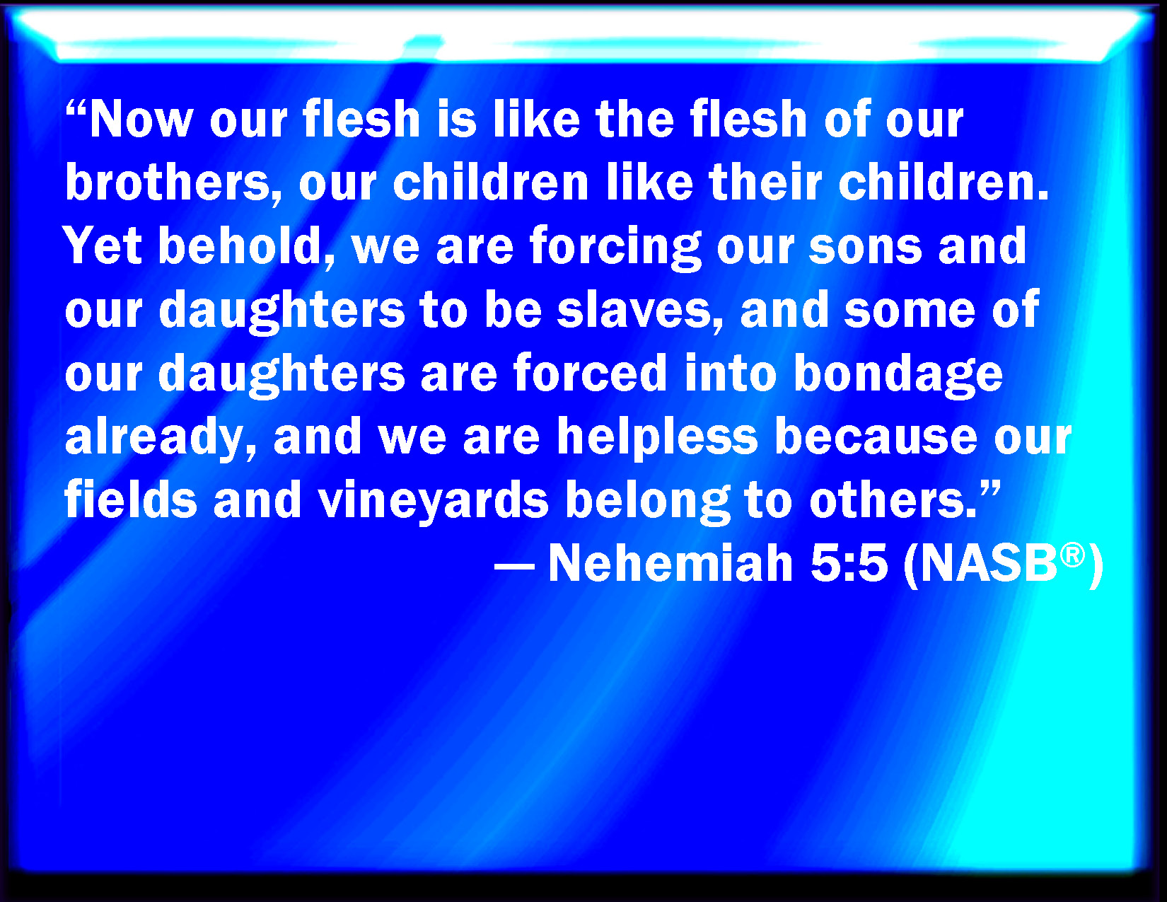 Bible Verse Slide Nehemiah 5:5 Yet now our flesh is as the flesh of our brothers, our children as their children: and, see, we bring into bondage our sons and our daughters to be servants, and some of our daughters are brought to bondage already: neither is it in our power to redeem them; for other men have our lands and vineyards. KJV: Yet now our flesh is as the flesh of our brethren, our children as their children: and, lo, we bring into bondage our sons and our daughters to be servants, and some of our daughters are brought unto bondage already: neither is it in our power to redeem them; for other men have our lands and vineyards. DRB: And now our flesh is as the flesh of our brethren: and our children as their children. Behold we bring into bondage our sons and our daughters, and some of our daughters are bondwomen already, neither have we wherewith to redeem them, and our fields and our vineyards other men possess. DBT: yet now our flesh is as the flesh of our brethren, our children as their children; and behold, we must bring into bondage our sons and our daughters to be servants, and some of our daughters are brought into bondage already; neither is it in the power of our hand to redeem them, for other men have our fields and our vineyards. ERV: Yet now our flesh is as the flesh of our brethren, our children as their children: and, lo, we bring into bondage our sons and our daughters to be servants, and some of our daughters are brought into bondage already: neither is it in our power to help it; for other men have our fields and our vineyards. WBT: Yet now our flesh is as the flesh of our brethren, our children as their children: and lo, we bring into bondage our sons and our daughters to be servants, and some of our daughters are brought to bondage already: neither is it in our power to redeem them; for other men have our lands and vineyards. WEB: Yet now our flesh is as the flesh of our brothers, our children as their children. Behold, we bring into bondage our sons and our daughters to be servants, and some of our daughters have been brought into bondage. Neither is it in our power to help it; for other men have our fields and our vineyards." YLT: and now, as the flesh of our brethren is our flesh, as their sons are our sons, and lo, we are subduing our sons and our daughters for servants, and there are of our daughters subdued, and our hand hath no might, and our fields and our vineyards are to others.'Links Nehemiah 5:5 NIV • Nehemiah 5:5 NLT • Nehemiah 5:5 ESV • Nehemiah 5:5 NASB • Nehemiah 5:5 KJV • Nehemiah 5:5 Interlinear • Nehemiah 5:5 Commentaries • Nehemiah 5:5 Parallel Texts • Nehemiah 5:5 Bible Apps • Nehemiah 5:5 Parallel • Bible Hub |