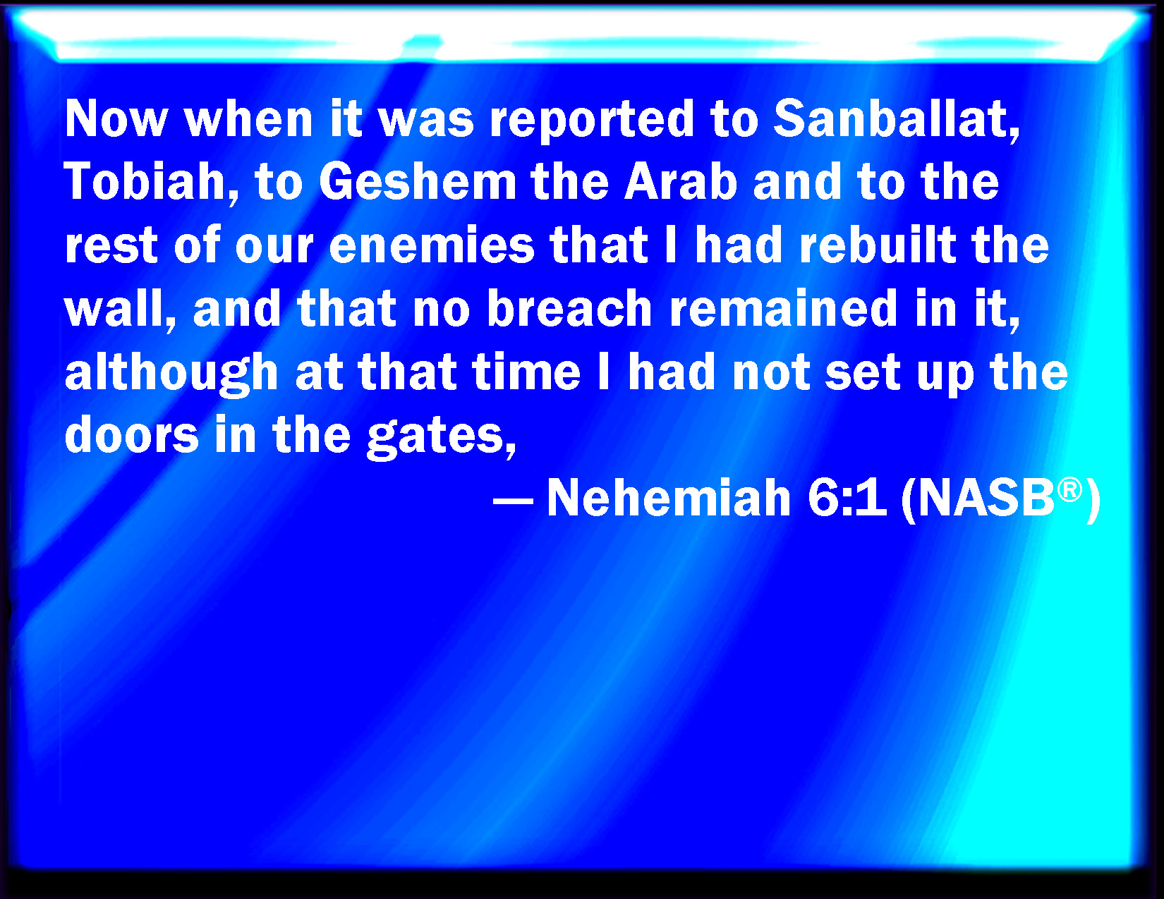 Bible Verse Slide Nehemiah 6:1 Now it came to pass when Sanballat, and Tobiah, and Geshem the Arabian, and the rest of our enemies, heard that I had built the wall, and that there was no breach left therein; (though at that time I had not set up the doors on the gates;) KJV: Now it came to pass, when Sanballat, and Tobiah, and Geshem the Arabian, and the rest of our enemies, heard that I had builded the wall, and that there was no breach left therein; (though at that time I had not set up the doors upon the gates;) DRB: And it came to pass, when Sanaballat, and Tobias, and Gossem the Arabian, and the rest of our enemies, heard that I had built the wall, and that there was no breach left in it, (though at that time I had not set up the doors in the gates,) DBT: And it came to pass when Sanballat, and Tobijah, and Geshem the Arabian, and the rest of our enemies, heard that I had built the wall, and that there was no breach left in it (though at that time I had not set up the doors in the gates), ERV: Now it came to pass, when it was reported to Sanballat and Tobiah, and to Geshem the Arabian, and unto the rest of our enemies, that I had builded the wall, and that there was no breach left therein; (though even unto that time I had not set up the doors in the gates;) WBT: Now it came to pass, when Sanballat, and Tobiah, and Geshem the Arabian, and the rest of our enemies, heard that I had built the wall, and that there was no breach left in it, (though at that time I had not set up the doors upon the gates;) WEB: Now it happened, when it was reported to Sanballat and Tobiah, and to Geshem the Arabian, and to the rest of our enemies, that I had built the wall, and that there was no breach left therein; (though even to that time I had not set up the doors in the gates;) YLT: And it cometh to pass, when it hath been heard by Sanballat, and Tobiah, and by Geshem the Arabian, and by the rest of our enemies, that I have builded the wall, and there hath not been left in it a breach, (also, till that time the doors I had not set up in the gates,)Links Nehemiah 6:1 NIV • Nehemiah 6:1 NLT • Nehemiah 6:1 ESV • Nehemiah 6:1 NASB • Nehemiah 6:1 KJV • Nehemiah 6:1 Interlinear • Nehemiah 6:1 Commentaries • Nehemiah 6:1 Parallel Texts • Nehemiah 6:1 Bible Apps • Nehemiah 6:1 Parallel • Bible Hub |