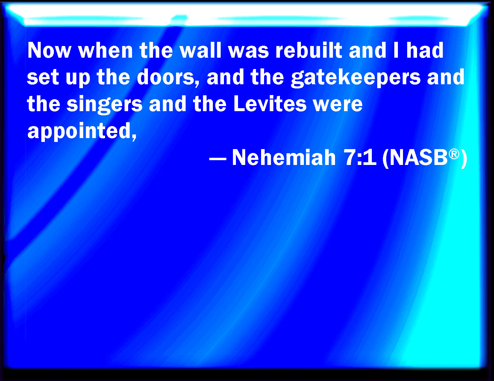 Bible Verse Slide Nehemiah 7:1 Now it came to pass, when the wall was built, and I had set up the doors, and the porters and the singers and the Levites were appointed, KJV: Now it came to pass, when the wall was built, and I had set up the doors, and the porters and the singers and the Levites were appointed, DRB: Now after the wall was built, and I had set up the doors, and numbered the porters and singing men, and Levites: DBT: And it came to pass when the wall was built, and I had set up the doors, that the doorkeepers and the singers and the Levites were appointed. ERV: Now it came to pass, when the wall was built, and I had set up the doors, and the porters and the singers and the Levites were appointed, WBT: Now it came to pass, when the wall was built, and I had set up the doors, and the porters and the singers and the Levites were appointed, WEB: Now it happened, when the wall was built, and I had set up the doors, and the porters and the singers and the Levites were appointed, YLT: And it cometh to pass, when the wall hath been built, that I set up the doors, and the gatekeepers are appointed, and the singers, and the Levites,Links Nehemiah 7:1 NIV • Nehemiah 7:1 NLT • Nehemiah 7:1 ESV • Nehemiah 7:1 NASB • Nehemiah 7:1 KJV • Nehemiah 7:1 Interlinear • Nehemiah 7:1 Commentaries • Nehemiah 7:1 Parallel Texts • Nehemiah 7:1 Bible Apps • Nehemiah 7:1 Parallel • Bible Hub |