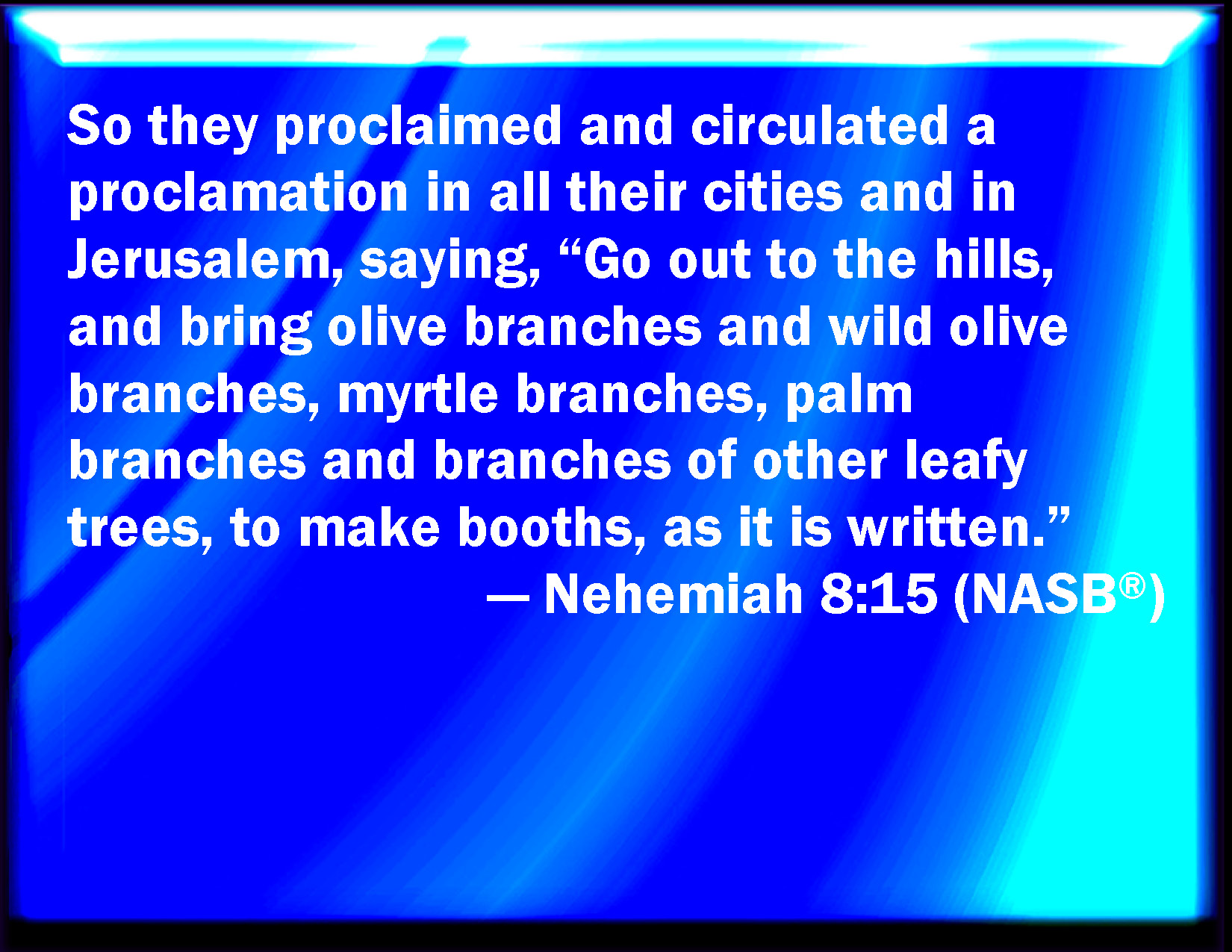 Bible Verse Slide Nehemiah 8:15 And that they should publish and proclaim in all their cities, and in Jerusalem, saying, Go forth to the mount, and fetch olive branches, and pine branches, and myrtle branches, and palm branches, and branches of thick trees, to make booths, as it is written. KJV: And that they should publish and proclaim in all their cities, and in Jerusalem, saying, Go forth unto the mount, and fetch olive branches, and pine branches, and myrtle branches, and palm branches, and branches of thick trees, to make booths, as it is written. DRB: And that they should proclaim and publish the word in all their cities, and in Jerusalem, saying: Go forth to the mount, and fetch branches of olive, and branches of beautiful wood, branches of myrtle, and branches of palm, and branches of thick trees, to make tabernacles, as it is written. DBT: and that they should publish and proclaim through all their cities, and at Jerusalem, saying, Go forth to the mount, and fetch olive-branches, and wild olive-branches, and myrtle-branches, and palm-branches, and branches of thick trees, to make booths, as it is written. ERV: and that they should publish and proclaim in all their cities, and in Jerusalem, saying, Go forth unto the mount, and fetch olive branches, and branches of wild olive, and myrtle branches, and palm branches, and branches of thick trees, to make booths, as it is written. WBT: And that they should publish and proclaim in all their cities, and in Jerusalem, saying, Go forth to the mount, and fetch olive branches, and pine branches, and myrtle branches, and palm branches, and branches of thick trees, to make booths, as it is written. WEB: and that they should publish and proclaim in all their cities, and in Jerusalem, saying, "Go out to the mountain, and get olive branches, and branches of wild olive, and myrtle branches, and palm branches, and branches of thick trees, to make booths, as it is written." YLT: and that they proclaim and cause to pass over all their cities, (and in Jerusalem,) saying, 'Go ye out to the mount, and bring leaves of the olive, and leaves of the oil tree, and leaves of the myrtle, and leaves of the palms, and leaves of thick trees, to make booths as it is written.'Links Nehemiah 8:15 NIV • Nehemiah 8:15 NLT • Nehemiah 8:15 ESV • Nehemiah 8:15 NASB • Nehemiah 8:15 KJV • Nehemiah 8:15 Interlinear • Nehemiah 8:15 Commentaries • Nehemiah 8:15 Parallel Texts • Nehemiah 8:15 Bible Apps • Nehemiah 8:15 Parallel • Bible Hub |