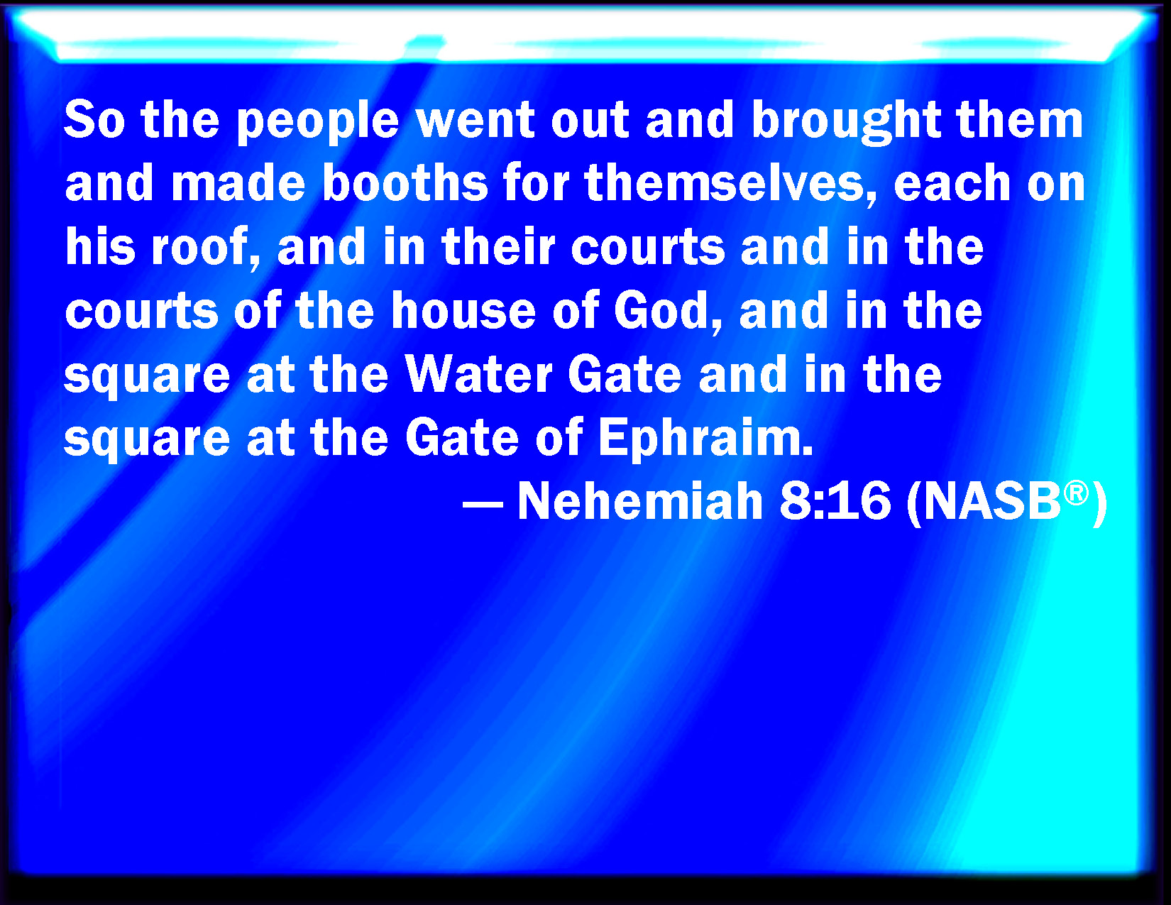 Bible Verse Slide Nehemiah 8:16 So the people went forth, and brought them, and made themselves booths, every one on the roof of his house, and in their courts, and in the courts of the house of God, and in the street of the water gate, and in the street of the gate of Ephraim. KJV: So the people went forth, and brought them, and made themselves booths, every one upon the roof of his house, and in their courts, and in the courts of the house of God, and in the street of the water gate, and in the street of the gate of Ephraim. DRB: And the people went forth, and brought. And they made themselves tabernacles every man on the top of his house, and in their courts, and in the courts of the house of God, and in the street of the water gate, and in the street of the gate of Ephraim. DBT: And the people went forth and brought them, and made themselves booths, everyone upon the roof of his house, and in their courts, and in the courts of the house of God, and in the open space of the water-gate, and in the open space of the gate of Ephraim. ERV: So the people went forth, and brought them, and made themselves booths, every one upon the roof of his house, and in their courts, and in the courts of the house of God, and in the broad place of the water gate, and in the broad place of the gate of Ephraim. WBT: So the people went forth, and brought them, and made themselves booths, every one upon the roof of his house, and in their courts, and in the courts of the house of God, and in the street of the water-gate, and in the street of the gate of Ephraim. WEB: So the people went out, and brought them, and made themselves booths, everyone on the roof of his house, and in their courts, and in the courts of the house of God, and in the broad place of the water gate, and in the broad place of the gate of Ephraim. YLT: And the people go out, and bring in, and make for themselves booths, each on his roof, and in their courts, and in the courts of the house of God, and in the broad place of the water-gate, and in the broad place of the gate of Ephraim.Links Nehemiah 8:16 NIV • Nehemiah 8:16 NLT • Nehemiah 8:16 ESV • Nehemiah 8:16 NASB • Nehemiah 8:16 KJV • Nehemiah 8:16 Interlinear • Nehemiah 8:16 Commentaries • Nehemiah 8:16 Parallel Texts • Nehemiah 8:16 Bible Apps • Nehemiah 8:16 Parallel • Bible Hub |