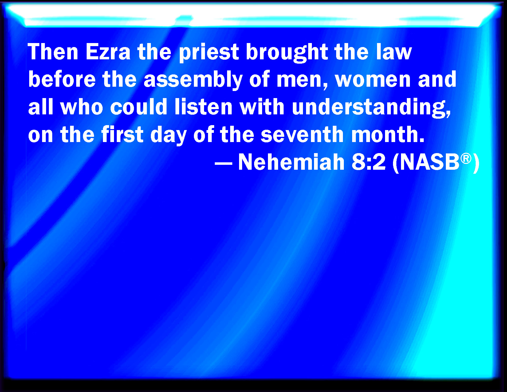 Bible Verse Slide Nehemiah 8:2 And Ezra the priest brought the law before the congregation both of men and women, and all that could hear with understanding, on the first day of the seventh month. KJV: And Ezra the priest brought the law before the congregation both of men and women, and all that could hear with understanding, upon the first day of the seventh month. DRB: Then Esdras the priest brought the law before the multitude of men and women, and all those that could understand, in the first day of the seventh month. DBT: And Ezra the priest brought the law before the congregation, both of men and women, and all that could hear with understanding, on the first day of the seventh month. ERV: And Ezra the priest brought the law before the congregation, both men and women, and all that could hear with understanding, upon the first day of the seventh month. WBT: And Ezra the priest brought the law before the congregation both of men and women, and all that could hear with understanding, upon the first day of the seventh month. WEB: Ezra the priest brought the law before the assembly, both men and women, and all who could hear with understanding, on the first day of the seventh month. YLT: And Ezra the priest bringeth the law before the assembly, both of men and women, and every one intelligent to hear, on the first day of the seventh month,Links Nehemiah 8:2 NIV • Nehemiah 8:2 NLT • Nehemiah 8:2 ESV • Nehemiah 8:2 NASB • Nehemiah 8:2 KJV • Nehemiah 8:2 Interlinear • Nehemiah 8:2 Commentaries • Nehemiah 8:2 Parallel Texts • Nehemiah 8:2 Bible Apps • Nehemiah 8:2 Parallel • Bible Hub |