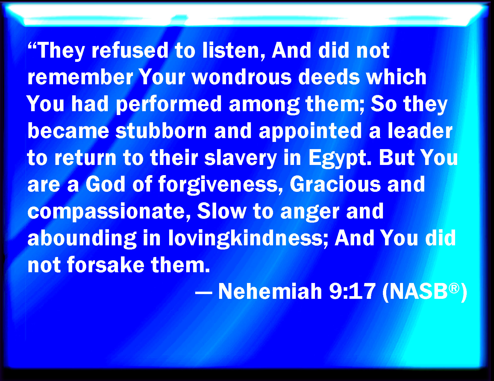 Bible Verse Slide Nehemiah 9:17 And refused to obey, neither were mindful of your wonders that you did among them; but hardened their necks, and in their rebellion appointed a captain to return to their bondage: but you are a God ready to pardon, gracious and merciful, slow to anger, and of great kindness, and forsook them not. KJV: And refused to obey, neither were mindful of thy wonders that thou didst among them; but hardened their necks, and in their rebellion appointed a captain to return to their bondage: but thou art a God ready to pardon, gracious and merciful, slow to anger, and of great kindness, and forsookest them not. DRB: And they would not hear, and they remembered not thy wonders which thou hadst done for them. And they hardened their necks, and gave the head to return to their bondage, as it were by contention. But thou, a forgiving God, gracious, and merciful, longsuffering, and full of compassion, didst not forsake them. DBT: and refused to obey, neither were they mindful of thy wonders which thou hadst done among them; but hardened their neck, and in their rebellion made a captain to return to their bondage. But thou art a +God ready to forgive, gracious and merciful, slow to anger and of great loving-kindness, and thou forsookest them not. ERV: and refused to obey, neither were mindful of thy wonders that thou didst among them; but hardened their neck, and in their rebellion appointed a captain to return to their bondage: but thou art a God ready to pardon, gracious and full of compassion, slow to anger, and plenteous in mercy, and forsookest them not. WBT: And refused to obey, neither were mindful of thy wonders that thou didst perform among them; but hardened their necks, and in their rebellion appointed a captain to return to their bondage: but thou art a God ready to pardon, gracious and merciful, slow to anger, and of great kindness, and forsookest them not. WEB: and refused to obey, neither were they mindful of your wonders that you did among them, but hardened their neck, and in their rebellion appointed a captain to return to their bondage. But you are a God ready to pardon, gracious and merciful, slow to anger, and abundant in loving kindness, and didn't forsake them. YLT: yea, they refuse to hearken, and have not remembered Thy wonders that Thou hast done with them, and harden their neck and appoint a head, to turn back to their service, in their rebellion; and Thou art a God of pardons, gracious, and merciful, long-suffering, and abundant in kindness, and hast not forsaken them.Links Nehemiah 9:17 NIV • Nehemiah 9:17 NLT • Nehemiah 9:17 ESV • Nehemiah 9:17 NASB • Nehemiah 9:17 KJV • Nehemiah 9:17 Interlinear • Nehemiah 9:17 Commentaries • Nehemiah 9:17 Parallel Texts • Nehemiah 9:17 Bible Apps • Nehemiah 9:17 Parallel • Bible Hub |