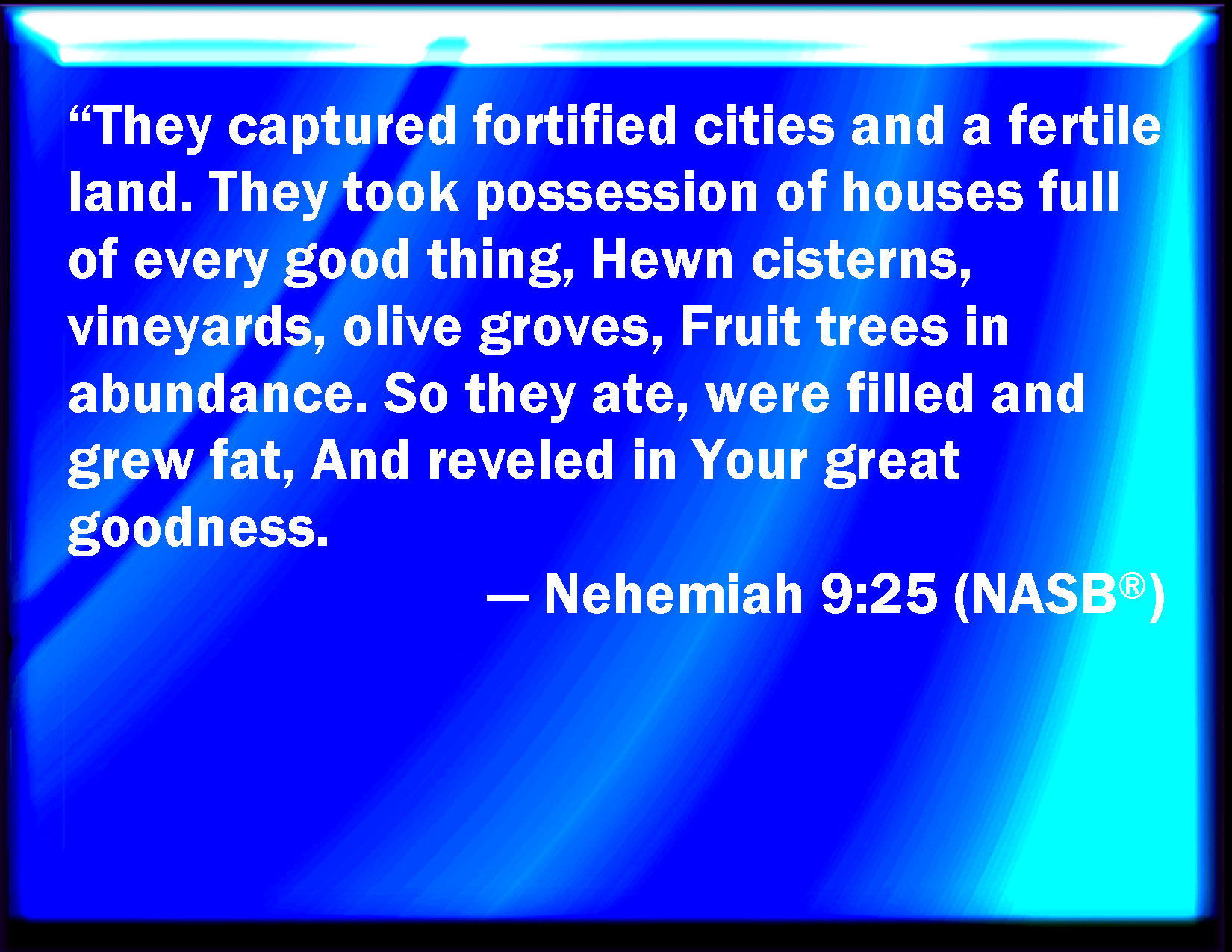 Bible Verse Slide Nehemiah 9:25 And they took strong cities, and a fat land, and possessed houses full of all goods, wells dig, vineyards, and olive groves, and fruit trees in abundance: so they did eat, and were filled, and became fat, and delighted themselves in your great goodness. KJV: And they took strong cities, and a fat land, and possessed houses full of all goods, wells digged, vineyards, and oliveyards, and fruit trees in abundance: so they did eat, and were filled, and became fat, and delighted themselves in thy great goodness. DRB: And they took strong cities and a fat land, and possessed houses full of all goods: cisterns made by others, vine- yards, and oliveyards, and fruit trees in abundance: and they ate, and were filled, and became fat, and abounded with de- light in thy great goodness. DBT: And they took strong cities, and a fat land, and possessed houses full of all good things, wells digged, vineyards and olive-gardens, and fruit trees in abundance. And they did eat and were filled, and became fat, and delighted themselves in thy great goodness. ERV: And they took fenced cities, and a fat land and possessed houses full of good things, cisterns hewn out, vineyards, and oliveyards, and fruit trees in abundance: so they did eat, and were filled, and became fat, and delighted themselves in thy great goodness. WBT: And they took strong cities, and a fat land, and possessed houses full of all goods, wells digged, vineyards and olive-yards, and fruit trees in abundance: so they ate and were filled, and became fat, and delighted themselves in thy great goodness. WEB: They took fortified cities, and a rich land, and possessed houses full of all good things, cisterns dug out, vineyards, and olive groves, and fruit trees in abundance. So they ate, were filled, became fat, and delighted themselves in your great goodness. YLT: And they capture fenced cities, and fat ground, and possess houses full of all good, digged-wells, vineyards, and olive-yards, and fruit-trees in abundance, and they eat, and are satisfied, and become fat, and delight themselves in Thy great goodness.Links Nehemiah 9:25 NIV • Nehemiah 9:25 NLT • Nehemiah 9:25 ESV • Nehemiah 9:25 NASB • Nehemiah 9:25 KJV • Nehemiah 9:25 Interlinear • Nehemiah 9:25 Commentaries • Nehemiah 9:25 Parallel Texts • Nehemiah 9:25 Bible Apps • Nehemiah 9:25 Parallel • Bible Hub |