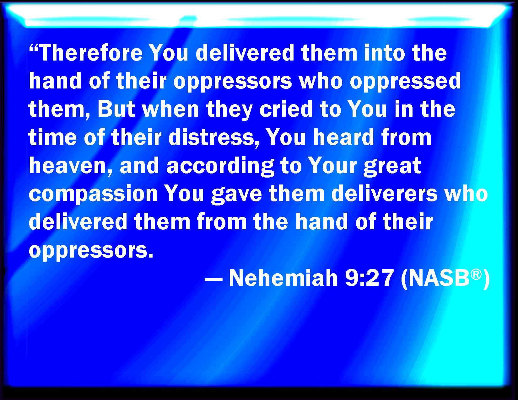 Bible Verse Slide Nehemiah 9:27 Therefore you delivered them into the hand of their enemies, who vexed them: and in the time of their trouble, when they cried to you, you heard them from heaven; and according to your manifold mercies you gave them saviors, who saved them out of the hand of their enemies. KJV: Therefore thou deliveredst them into the hand of their enemies, who vexed them: and in the time of their trouble, when they cried unto thee, thou heardest them from heaven; and according to thy manifold mercies thou gavest them saviours, who saved them out of the hand of their enemies. DRB: And thou gavest them into the hands of their enemies, and they afflicted them. And in the time of their tribulation they cried to thee, and thou heardest from heaven, and according to the multitude of thy tender mercies thou gavest them saviours, to save them from the hands of their enemies. DBT: And thou gavest them into the hand of their oppressors, and they oppressed them; and in the time of their distress, when they cried unto thee, thou heardest them from the heavens, and according to thy manifold mercies thou gavest them saviours, who saved them out of the hand of their oppressors. ERV: Therefore thou deliveredst them into the hand of their adversaries, who distressed them: and in the time of their trouble, when they cried unto thee, thou heardest from heaven; and according to thy manifold mercies thou gavest them saviours who saved them out of the hand of their adversaries. WBT: Therefore thou deliveredst them into the hand of their enemies, who distressed them: and in the time of their trouble, when they cried to thee, thou hearedest them from heaven; and according to thy manifold mercies thou gavest them deliverers, who saved them out of the hand of their enemies. WEB: Therefore you delivered them into the hand of their adversaries, who distressed them. In the time of their trouble, when they cried to you, you heard from heaven; and according to your manifold mercies you gave them saviors who saved them out of the hand of their adversaries. YLT: and Thou givest them into the hand of their adversaries, and they distress them, and in the time of their distress they cry unto Thee, and Thou, from the heavens, dost hear, and, according to Thine abundant mercies, dost give to them saviours, and they save them out of the hand of their adversaries.Links Nehemiah 9:27 NIV • Nehemiah 9:27 NLT • Nehemiah 9:27 ESV • Nehemiah 9:27 NASB • Nehemiah 9:27 KJV • Nehemiah 9:27 Interlinear • Nehemiah 9:27 Commentaries • Nehemiah 9:27 Parallel Texts • Nehemiah 9:27 Bible Apps • Nehemiah 9:27 Parallel • Bible Hub |