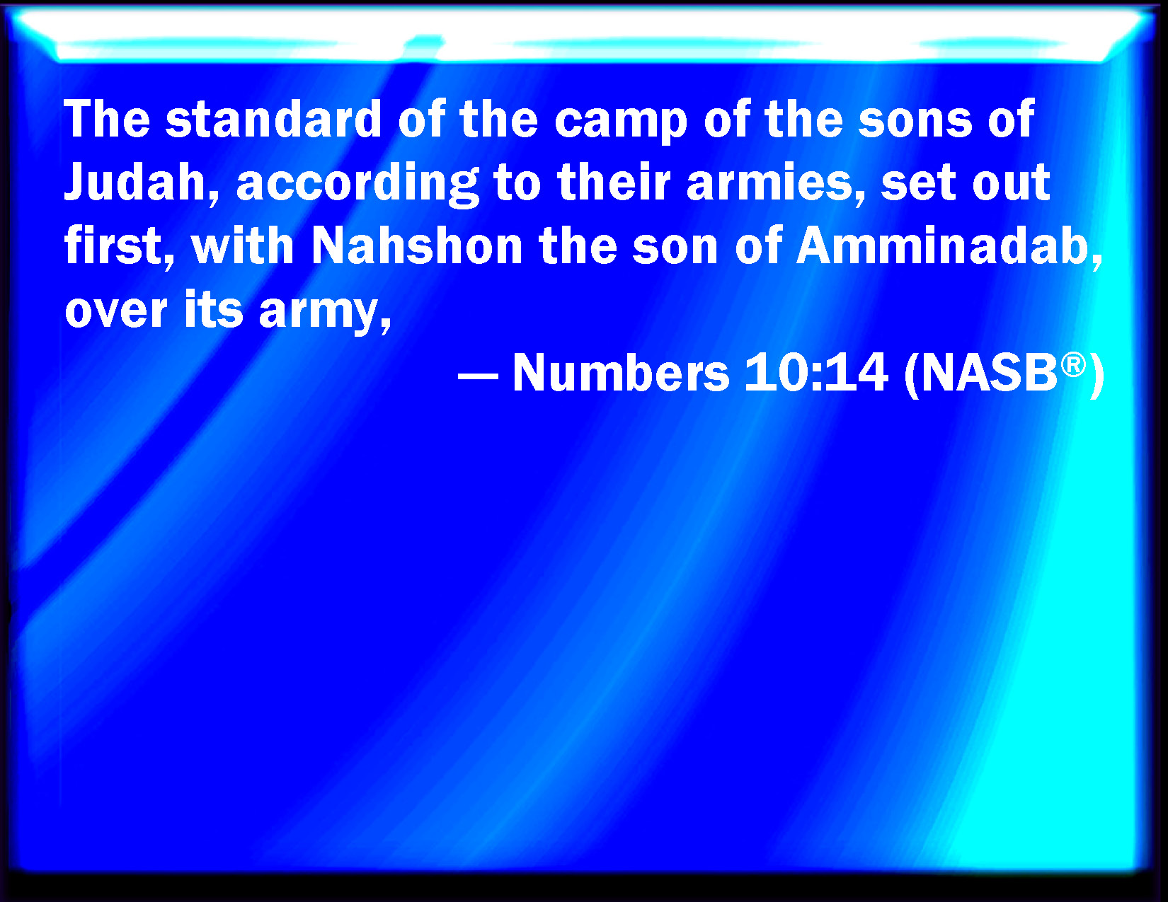 First, the standard of the camp of the children of Judah went forward according to their armies. Nahshon the son of Amminadab was over his army.