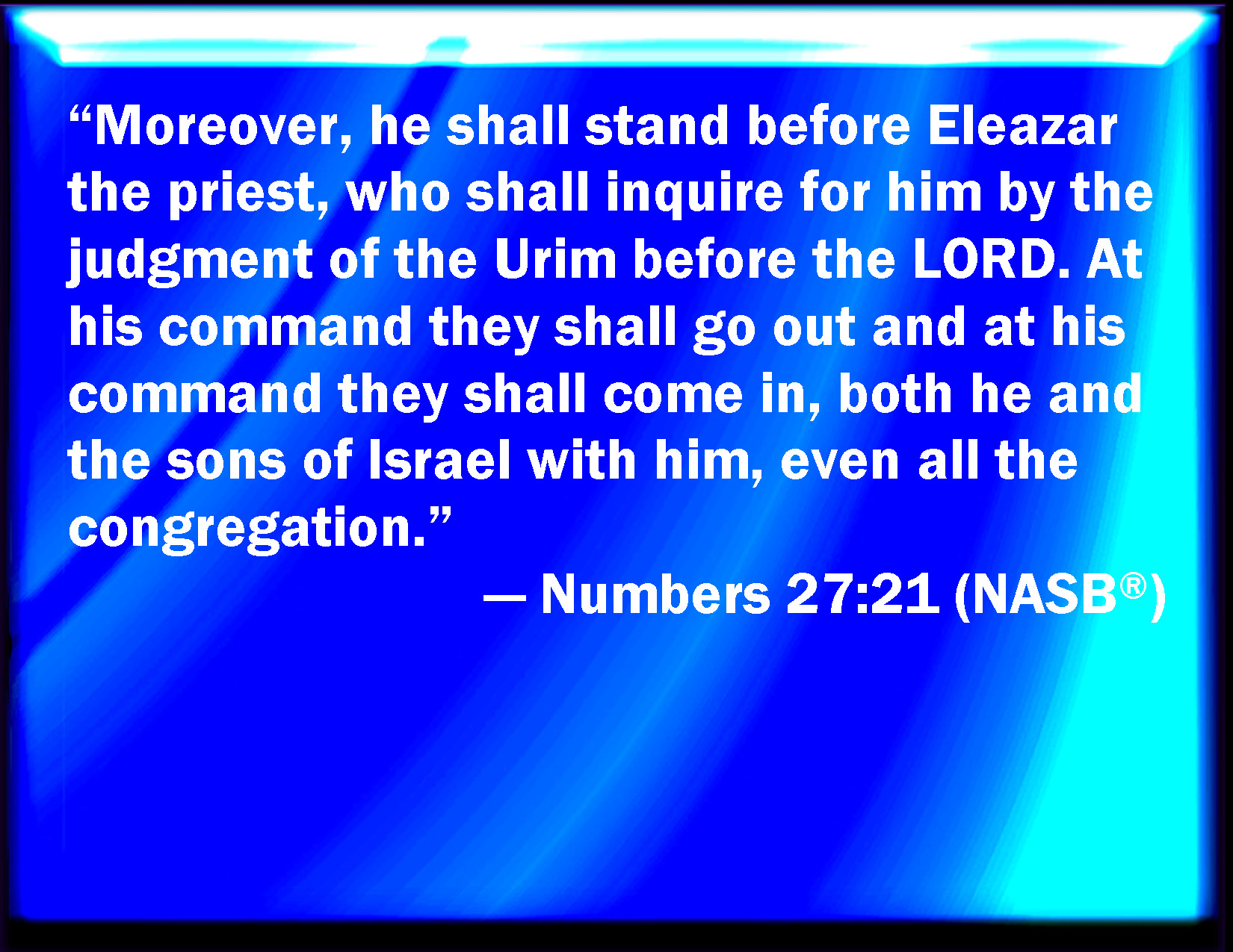 Bible Verse Slide Numbers 27:21 And he shall stand before Eleazar the priest, who shall ask counsel for him after the judgment of Urim before the LORD: at his word shall they go out, and at his word they shall come in, both he, and all the children of Israel with him, even all the congregation. KJV: And he shall stand before Eleazar the priest, who shall ask counsel for him after the judgment of Urim before the LORD: at his word shall they go out, and at his word they shall come in, both he, and all the children of Israel with him, even all the congregation. DRB: If any thing be to be done, Eleazar the priest shall consult the Lord for him. He and all the children of Israel with him, and the rest of the multitude shall go out and go in at his word. DBT: And he shall stand before Eleazar the priest, who shall inquire for him, by the judgment of the Urim before Jehovah: at his word shall they go out, and at his word they shall come in, he, and all the children of Israel with him, even the whole assembly. ERV: And he shall stand before Eleazar the priest, who shall inquire for him by the judgment of the Urim before the LORD: at his word shall they go out, and at his word they shall come in, both he, and all the children of Israel with him, even all the congregation. WBT: And he shall stand before Eleazar the priest, who shall ask counsel for him after the judgment of Urim before the LORD: at his word shall they go out, and at his word they shall come in, both he, and all the children of Israel with him, even all the congregation. WEB: He shall stand before Eleazar the priest, who shall inquire for him by the judgment of the Urim before Yahweh: at his word shall they go out, and at his word they shall come in, both he, and all the children of Israel with him, even all the congregation." YLT: 'And before Eleazar the priest he standeth, and he hath asked for him by the judgment of the Lights before Jehovah; at His word they go out, and at His word they come in; he, and all the sons of Israel with him, even all the company.'Links Numbers 27:21 NIV • Numbers 27:21 NLT • Numbers 27:21 ESV • Numbers 27:21 NASB • Numbers 27:21 KJV • Numbers 27:21 Interlinear • Numbers 27:21 Commentaries • Numbers 27:21 Parallel Texts • Numbers 27:21 Bible Apps • Numbers 27:21 Parallel • Bible Hub |