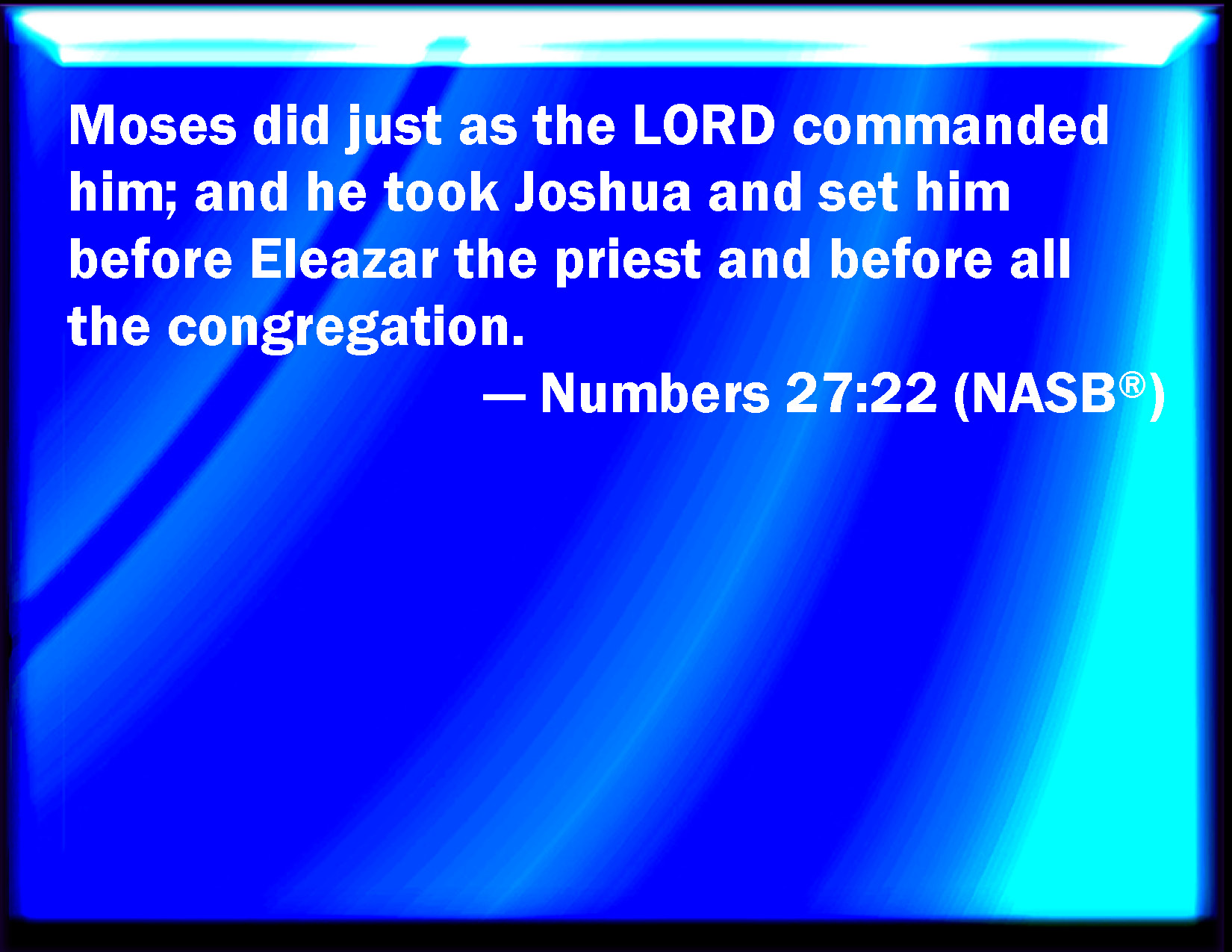 Bible Verse Slide Numbers 27:22 And Moses did as the LORD commanded him: and he took Joshua, and set him before Eleazar the priest, and before all the congregation: KJV: And Moses did as the LORD commanded him: and he took Joshua, and set him before Eleazar the priest, and before all the congregation: DRB: Moses did as the Lord had commanded. And when he had taken Josue, he set him before Eleazar the priest, and all the assembly of the people, DBT: And Moses did as Jehovah had commanded him; and he took Joshua and set him before Eleazar the priest, and before the whole assembly. ERV: And Moses did as the LORD commanded him: and he took Joshua, and set him before Eleazar the priest, and before all the congregation: WBT: And Moses did as the LORD commanded him: and he took Joshua, and set him before Eleazar the priest, and before all the congregation: WEB: Moses did as Yahweh commanded him; and he took Joshua, and set him before Eleazar the priest, and before all the congregation: YLT: And Moses doth as Jehovah hath commanded him, and taketh Joshua, and causeth him to stand before Eleazar the priest, and before all the company,Links Numbers 27:22 NIV • Numbers 27:22 NLT • Numbers 27:22 ESV • Numbers 27:22 NASB • Numbers 27:22 KJV • Numbers 27:22 Interlinear • Numbers 27:22 Commentaries • Numbers 27:22 Parallel Texts • Numbers 27:22 Bible Apps • Numbers 27:22 Parallel • Bible Hub |