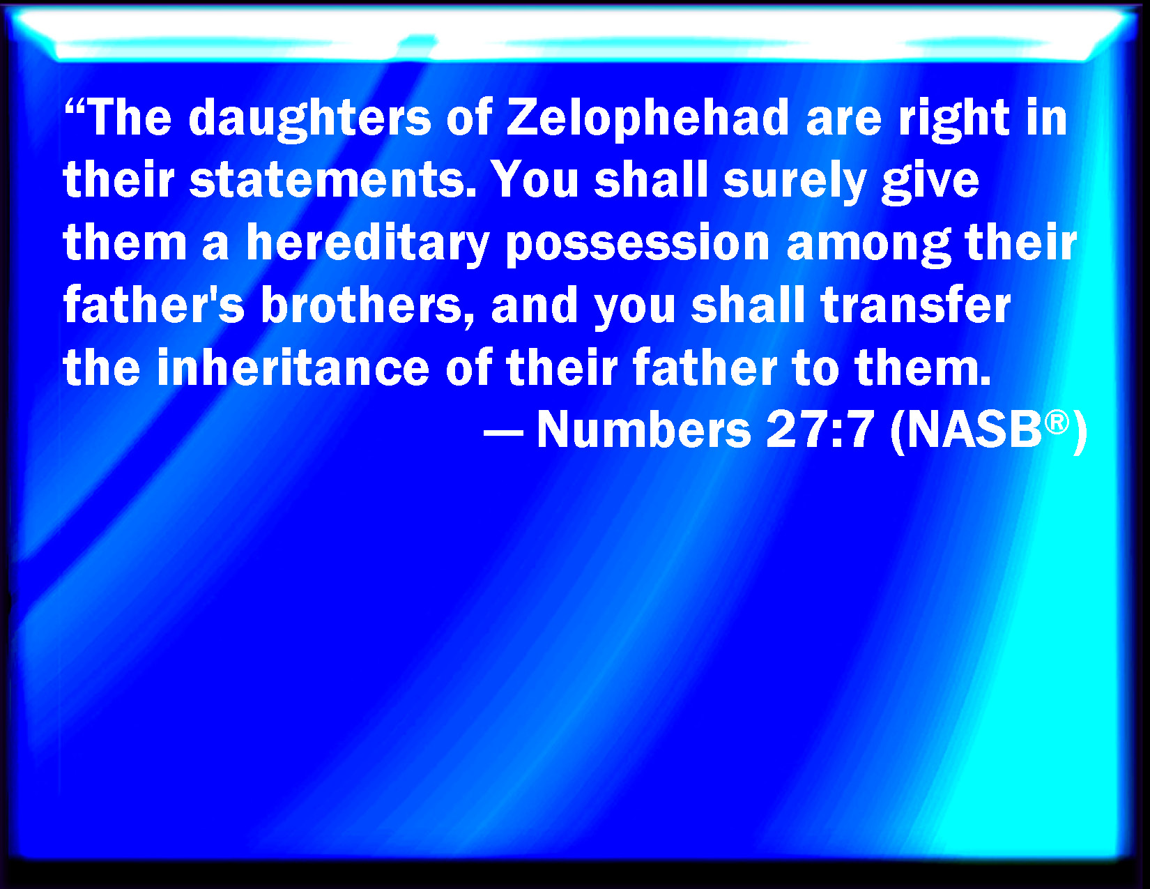 Numbers 27:7 The daughters of Zelophehad speak right: you shall surely give them a possession of an inheritance among their father's brothers; and you shall cause the inheritance of their father to pass to them.