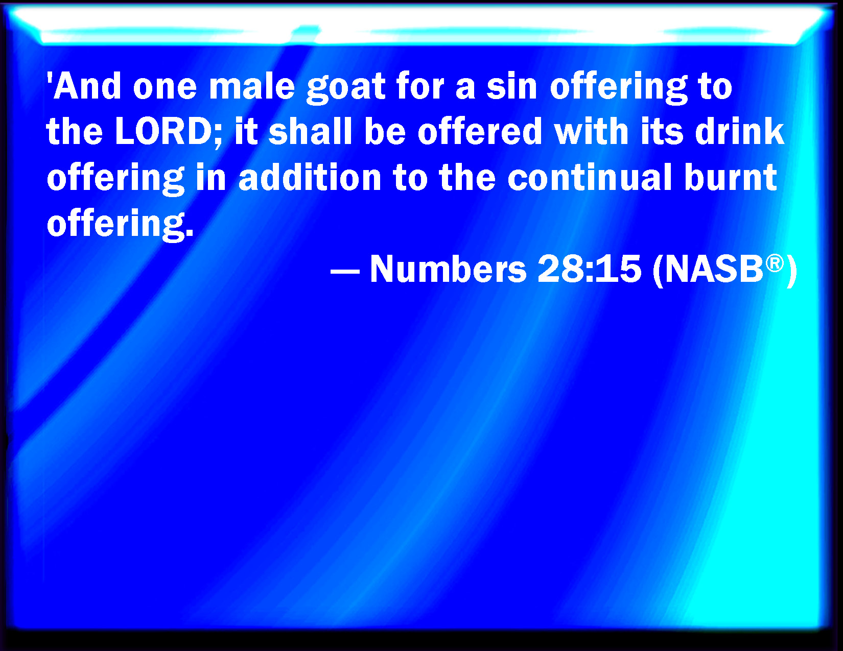 Bible Verse Slide Numbers 28:15 And one kid of the goats for a sin offering to the LORD shall be offered, beside the continual burnt offering, and his drink offering. KJV: And one kid of the goats for a sin offering unto the LORD shall be offered, beside the continual burnt offering, and his drink offering. DRB: A buck goat also shall be offered to the Lord for a sin offering over and above the perpetual holocaust with its libations. DBT: And a buck of the goats shall be offered, for a sin-offering to Jehovah, besides the continual burnt-offering, and its drink-offering. ERV: And one he-goat for a sin offering unto the LORD; it shall be offered beside the continual burnt offering, and the drink offering thereof. WBT: And one kid of the goats for a sin-offering to the LORD shall be offered, besides the continual burnt-offering, and his drink-offering. WEB: One male goat for a sin offering to Yahweh; it shall be offered besides the continual burnt offering, and the drink offering of it. YLT: and one kid of the goats for a sin-offering to Jehovah; besides the continual burnt-offering it is prepared, and its libation.Links Numbers 28:15 NIV • Numbers 28:15 NLT • Numbers 28:15 ESV • Numbers 28:15 NASB • Numbers 28:15 KJV • Numbers 28:15 Interlinear • Numbers 28:15 Commentaries • Numbers 28:15 Parallel Texts • Numbers 28:15 Bible Apps • Numbers 28:15 Parallel • Bible Hub |