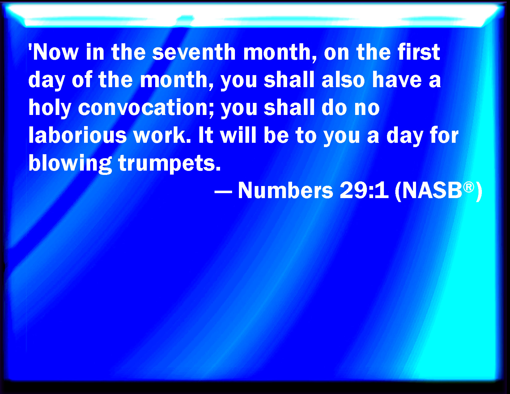 Bible Verse Slide Numbers 29:1 And in the seventh month, on the first day of the month, you shall have an holy convocation; you shall do no servile work: it is a day of blowing the trumpets to you. KJV: And in the seventh month, on the first day of the month, ye shall have an holy convocation; ye shall do no servile work: it is a day of blowing the trumpets unto you. DRB: The first day also of the seventh month shall be venerable and holy unto you; you shall do no servile work therein, because it is the day of the sounding and of trumpets. DBT: And in the seventh month, on the first of the month, ye shall have a holy convocation: no manner of servile work shall ye do; a day of blowing the trumpets shall it be unto you. ERV: And in the seventh month, on the first day of the month, ye shall have an holy convocation; ye shall do no servile work: it is a day of blowing of trumpets unto you. WBT: And in the seventh month, on the first day of the month, ye shall have a holy convocation; ye shall do no servile work: it is a day of blowing the trumpets to you. WEB: "'In the seventh month, on the first day of the month, you shall have a holy convocation; you shall do no servile work: it is a day of blowing of trumpets to you. YLT: 'And in the seventh month, in the first of the month, a holy convocation ye have, ye do no servile work; a day of shouting it is to you;Links Numbers 29:1 NIV • Numbers 29:1 NLT • Numbers 29:1 ESV • Numbers 29:1 NASB • Numbers 29:1 KJV • Numbers 29:1 Interlinear • Numbers 29:1 Commentaries • Numbers 29:1 Parallel Texts • Numbers 29:1 Bible Apps • Numbers 29:1 Parallel • Bible Hub |