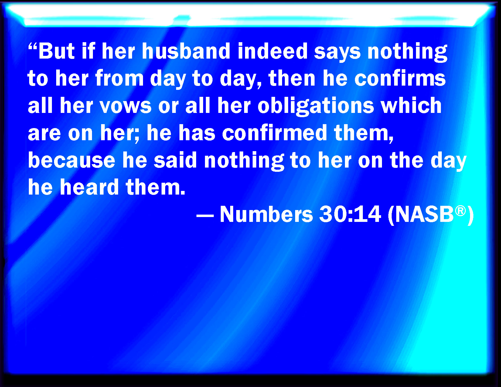 Bible Verse Slide Numbers 30:14 But if her husband altogether hold his peace at her from day to day; then he establishes all her vows, or all her bonds, which are on her: he confirms them, because he held his peace at her in the day that he heard them. KJV: But if her husband altogether hold his peace at her from day to day; then he establisheth all her vows, or all her bonds, which are upon her: he confirmeth them, because he held his peace at her in the day that he heard them. DRB: But if the husband hearing it hold his peace, and defer the declaring his mind till another day: whatsoever she had vowed and promised, she shall fulfil: because immediately as he heard it, he held his peace. DBT: And if her husband be altogether silent at her from day to day, then he hath established all her vows or all her bonds which are upon her; he hath confirmed them, for he hath been silent at her in the day that he heard them. ERV: But if her husband altogether hold his peace at her from day to day; then he establisheth all her vows, or all her bonds, which are upon her: he hath established them, because he held his peace at her in the day that he heard them. WBT: But if her husband altogether holds his peace at her from day to day; then he establisheth all her vows, or all her bonds, which are upon her: he confirmeth them, because he held his peace at her in the day that he heard them. WEB: But if her husband altogether hold his peace at her from day to day, then he establishes all her vows, or all her bonds, which are on her: he has established them, because he held his peace at her in the day that he heard them. YLT: and if her husband certainly keep silent at her, from day unto day, then he hath established all her vows, or all her bonds which are upon her; he hath established them, for he hath kept silent at her in the day of his hearing;Links Numbers 30:14 NIV • Numbers 30:14 NLT • Numbers 30:14 ESV • Numbers 30:14 NASB • Numbers 30:14 KJV • Numbers 30:14 Interlinear • Numbers 30:14 Commentaries • Numbers 30:14 Parallel Texts • Numbers 30:14 Bible Apps • Numbers 30:14 Parallel • Bible Hub |