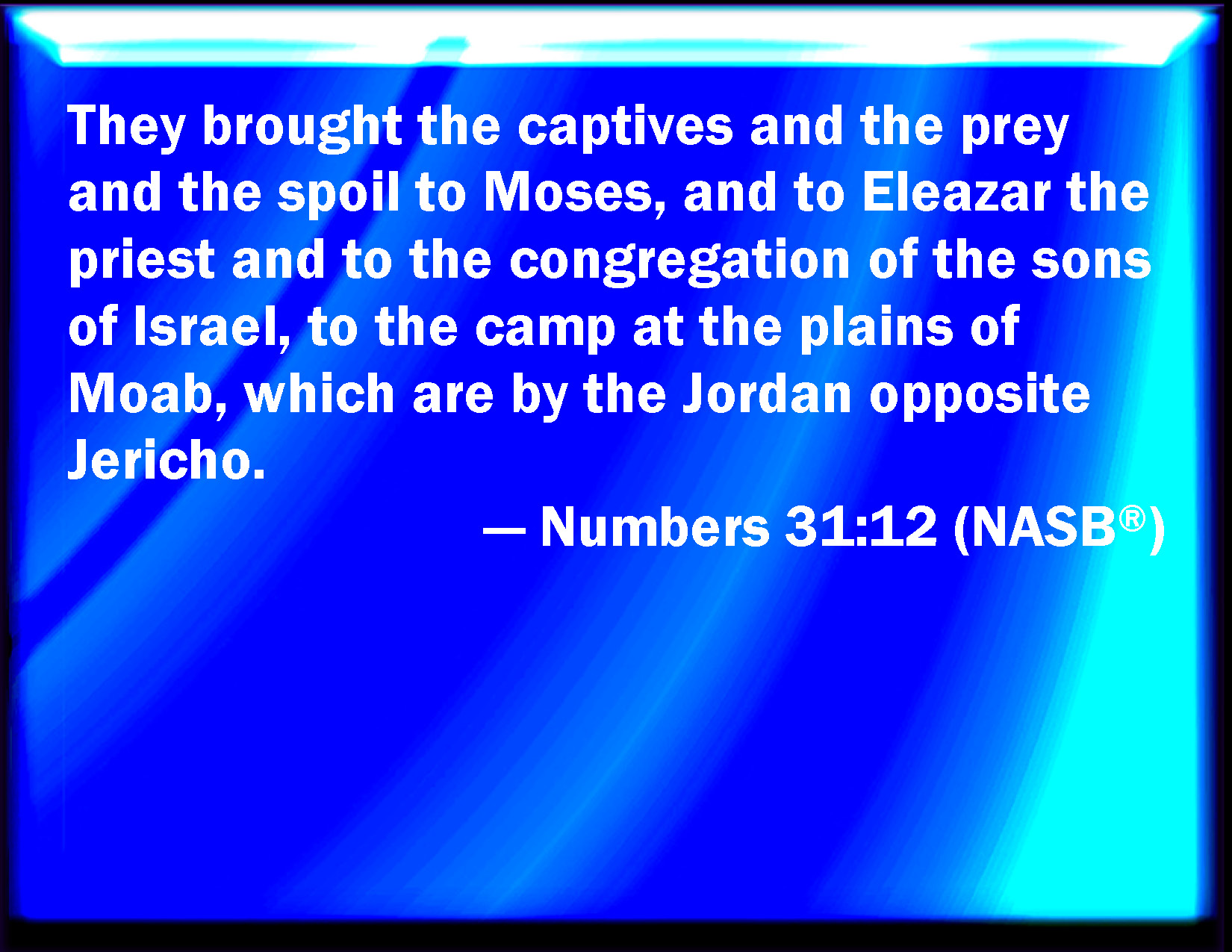 Bible Verse Slide Numbers 31:12 And they brought the captives, and the prey, and the spoil, to Moses, and Eleazar the priest, and to the congregation of the children of Israel, to the camp at the plains of Moab, which are by Jordan near Jericho. KJV: And they brought the captives, and the prey, and the spoil, unto Moses, and Eleazar the priest, and unto the congregation of the children of Israel, unto the camp at the plains of Moab, which are by Jordan near Jericho. DRB: And they brought them to Moses, and Eleazar the priest, and to all the multitude of the children of Israel. But the rest of the things for use they carried to the camp on the plains of Moab, beside the Jordan over against Jericho. DBT: and they brought to Moses and Eleazar the priest, and to the assembly of the children of Israel, the captives and the prey and the booty, to the camp in the plains of Moab, which are by the Jordan of Jericho. ERV: And they brought the captives, and the prey, and the spoil, unto Moses, and unto Eleazar the priest, and unto the congregation of the children of Israel, unto the camp at the plains of Moab, which are by the Jordan at Jericho. WBT: And they brought the captives, and the prey, and the spoil to Moses and Eleazar the priest, and to the congregation of the children of Israel, to the camp at the plains of Moab, which are by Jordan near Jericho. WEB: They brought the captives, and the prey, and the spoil, to Moses, and to Eleazar the priest, and to the congregation of the children of Israel, to the camp at the plains of Moab, which are by the Jordan at Jericho. YLT: and they bring in, unto Moses, and unto Eleazar the priest, and unto the company of the sons of Israel, the captives, and the prey, and the spoil, unto the camp, unto the plains of Moab, which are by Jordan, near Jericho.Links Numbers 31:12 NIV • Numbers 31:12 NLT • Numbers 31:12 ESV • Numbers 31:12 NASB • Numbers 31:12 KJV • Numbers 31:12 Interlinear • Numbers 31:12 Commentaries • Numbers 31:12 Parallel Texts • Numbers 31:12 Bible Apps • Numbers 31:12 Parallel • Bible Hub |