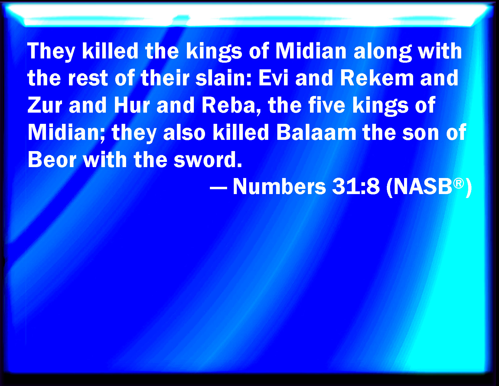Bible Verse Slide Numbers 31:8 And they slew the kings of Midian, beside the rest of them that were slain; namely, Evi, and Rekem, and Zur, and Hur, and Reba, five kings of Midian: Balaam also the son of Beor they slew with the sword. KJV: And they slew the kings of Midian, beside the rest of them that were slain; namely, Evi, and Rekem, and Zur, and Hur, and Reba, five kings of Midian: Balaam also the son of Beor they slew with the sword. DRB: And their kings Evi, and Recem, and Sur, and Hur, and Rebe, five princes of the nation: Balaam also the son of Beer they killed with the sword. DBT: And they slew the kings of Midian, besides the others slain, Evi, and Rekem, and Zur, and Hur, and Reba, five kings of Midian; and Balaam the son of Beor they slew with the sword. ERV: And they slew the kings of Midian with the rest of their slain; Evi, and Rekem, and Zur, and Hur, and Reba, the five kings of Midian: Balaam also the son of Beor they slew with the sword. WBT: And they slew the kings of Midian, besides the rest of them that were slain; namely, Evi, and Rekem, and Zur, and Hur, and Reba, five kings of Midian: Balaam also the son of Beor they slew with the sword. WEB: They killed the kings of Midian with the rest of their slain: Evi, and Rekem, and Zur, and Hur, and Reba, the five kings of Midian: Balaam also the son of Beor they killed with the sword. YLT: and the kings of Midian they have slain, besides their pierced ones, Evi, and Rekem, and Zur, and Hur, and Reba, five kings of Midian; and Balaam son of Beor, they have slain with the sword.Links Numbers 31:8 NIV • Numbers 31:8 NLT • Numbers 31:8 ESV • Numbers 31:8 NASB • Numbers 31:8 KJV • Numbers 31:8 Interlinear • Numbers 31:8 Commentaries • Numbers 31:8 Parallel Texts • Numbers 31:8 Bible Apps • Numbers 31:8 Parallel • Bible Hub |