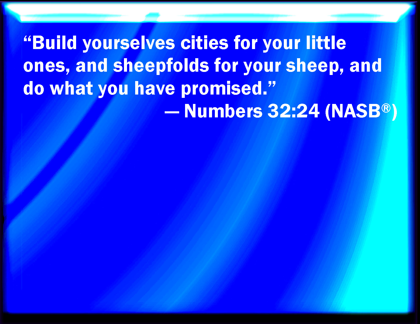 Bible Verse Slide Numbers 32:24 Build you cities for your little ones, and folds for your sheep; and do that which has proceeded out of your mouth. KJV: Build you cities for your little ones, and folds for your sheep; and do that which hath proceeded out of your mouth. DRB: Build therefore cities for your children, and folds and stalls for your sheep and beasts, and accomplish what you have promised. DBT: Build yourselves cities for your little ones, and folds for your flocks, and do that which has gone out of your mouth. ERV: Build you cities for your little ones, and folds for your sheep; and do that which hath proceeded out of your mouth. WBT: Build you cities for your little ones, and folds for your sheep; and do that which hath proceeded out of your mouth. WEB: Build cities for your little ones, and folds for your sheep; and do that which has proceeded out of your mouth." YLT: build for yourselves cities for your infants, and folds for your flock, and that which is going out from your mouth do ye.'Links Numbers 32:24 NIV • Numbers 32:24 NLT • Numbers 32:24 ESV • Numbers 32:24 NASB • Numbers 32:24 KJV • Numbers 32:24 Interlinear • Numbers 32:24 Commentaries • Numbers 32:24 Parallel Texts • Numbers 32:24 Bible Apps • Numbers 32:24 Parallel • Bible Hub |