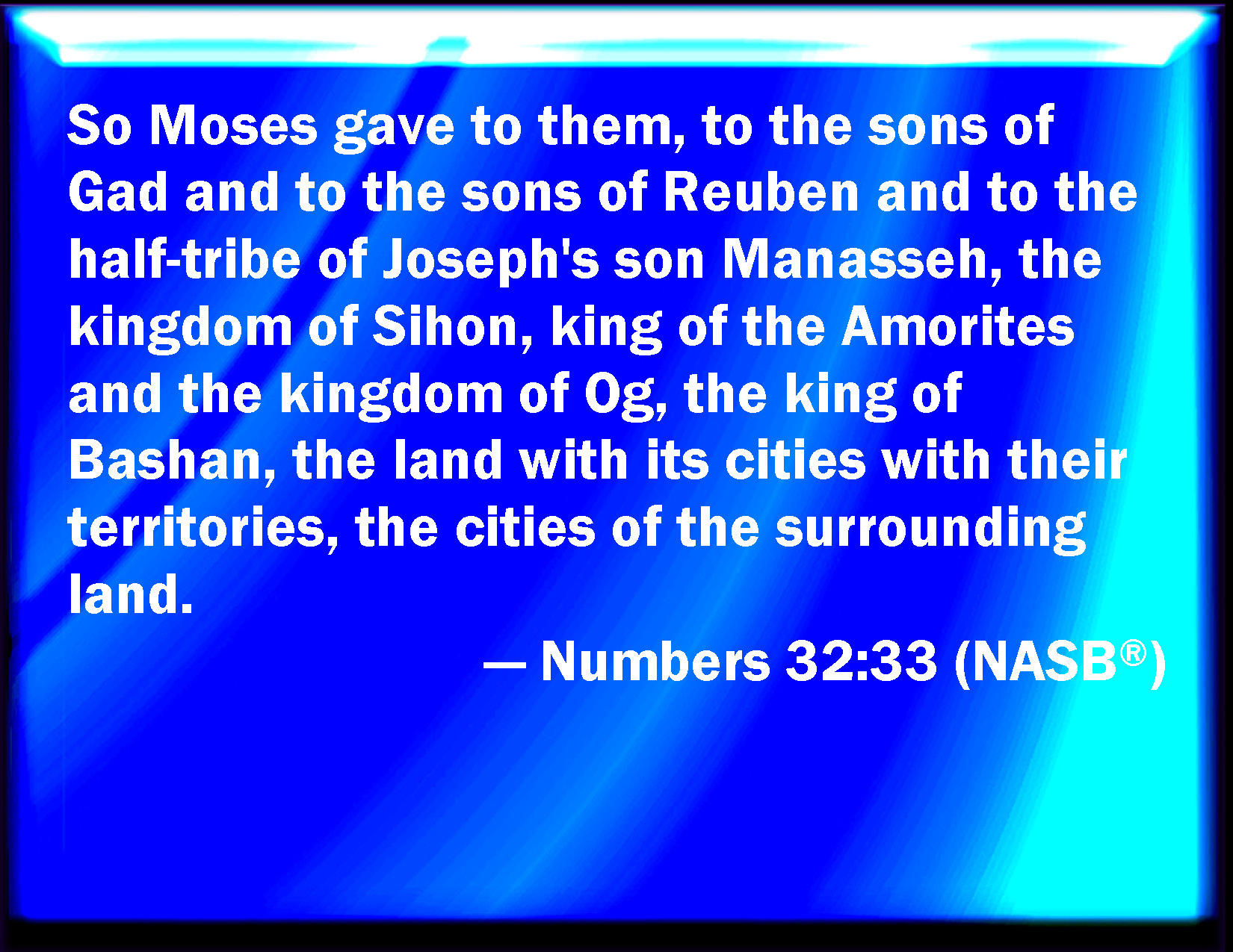 Bible Verse Slide Numbers 32:33 And Moses gave to them, even to the children of Gad, and to the children of Reuben, and to half the tribe of Manasseh the son of Joseph, the kingdom of Sihon king of the Amorites, and the kingdom of Og king of Bashan, the land, with the cities thereof in the coasts, even the cities of the country round about. KJV: And Moses gave unto them, even to the children of Gad, and to the children of Reuben, and unto half the tribe of Manasseh the son of Joseph, the kingdom of Sihon king of the Amorites, and the kingdom of Og king of Bashan, the land, with the cities thereof in the coasts, even the cities of the country round about. DRB: Moses therefore gave to the children of Cad and of Ruben, and to the half tribe of Manasses the son of Joseph, the kingdom of Sehon king of the Amorrhites, and the kingdom of Og king of Basan, and their land and the cities thereof round about. DBT: And Moses gave to them, to the children of Gad, and to the children of Reuben, and to half the tribe of Manasseh the son of Joseph, the kingdom of Sihon king of the Amorites, and the kingdom of Og the king of Bashan, the land, according to its cities and territories, the cities of the land round about. ERV: And Moses gave unto them, even to the children of Gad, and to the children of Reuben, and unto the half tribe of Manasseh the son of Joseph, the kingdom of Sihon king of the Amorites, and the kingdom of Og king of Bashan, the land, according to the cities thereof with their borders, even the cities of the land round about. WBT: And Moses gave to them, even to the children of Gad, and to the children of Reuben, and to half the tribe of Manasseh the son of Joseph, the kingdom of Sihon king of the Amorites, and the kingdom of Og king of Bashan, the land, with its cities in the borders, even the cities of the country around. WEB: Moses gave to them, even to the children of Gad, and to the children of Reuben, and to the half-tribe of Manasseh the son of Joseph, the kingdom of Sihon king of the Amorites, and the kingdom of Og king of Bashan, the land, according to the cities of it with [their] borders, even the cities of the surrounding land. YLT: And Moses giveth to them, to the sons of Gad, and to the sons of Reuben, and to the half of the tribe of Manasseh son of Joseph, the kingdom of Sihon king of the Amorite, and the kingdom of Og king of Bashan, the land by its cities, in the borders, the cities of the land round about.Links Numbers 32:33 NIV • Numbers 32:33 NLT • Numbers 32:33 ESV • Numbers 32:33 NASB • Numbers 32:33 KJV • Numbers 32:33 Interlinear • Numbers 32:33 Commentaries • Numbers 32:33 Parallel Texts • Numbers 32:33 Bible Apps • Numbers 32:33 Parallel • Bible Hub |