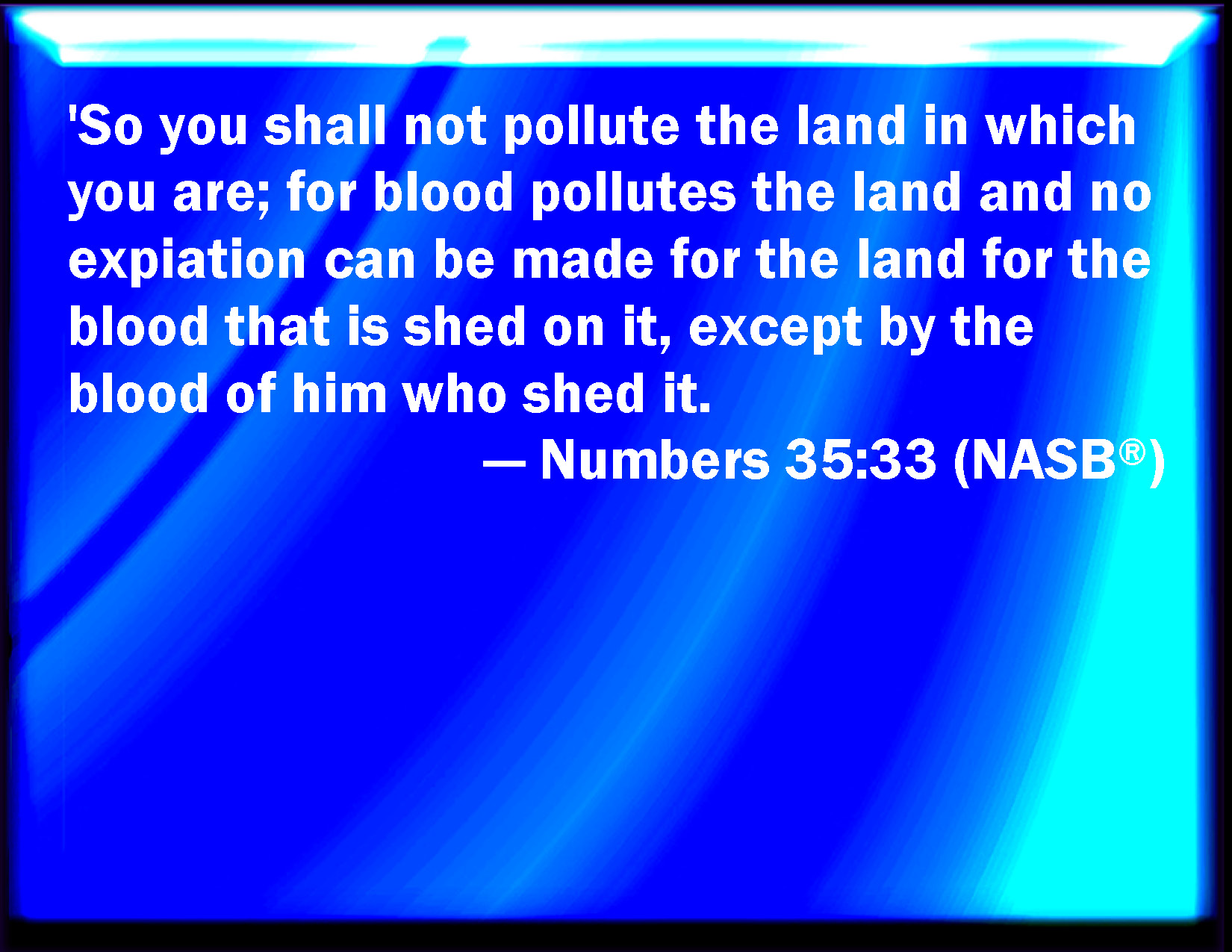 Bible Verse Slide Numbers 35:33 So you shall not pollute the land wherein you are: for blood it defiles the land: and the land cannot be cleansed of the blood that is shed therein, but by the blood of him that shed it. KJV: So ye shall not pollute the land wherein ye are: for blood it defileth the land: and the land cannot be cleansed of the blood that is shed therein, but by the blood of him that shed it. DRB: Defile not the land of your habitation, which is stained with the blood of the innocent: neither can it otherwise be expiated, but by his blood that hath shed the blood of another. DBT: And ye shall not pollute the land wherein ye are; for blood, it polluteth the land; and there can be no atonement made for the land, for the blood that hath been shed therein, but by the blood of him that shed it. ERV: So ye shall not pollute the land wherein ye are: for blood, it polluteth the land: and no expiation can be made for the land for the blood that is shed therein, but by the blood of him that shed it. WBT: So ye shall not pollute the land in which ye are: for blood it defileth the land: and the land cannot be cleansed of the blood that is shed in it, but by the blood of him that shed it. WEB: "'So you shall not pollute the land in which you are: for blood, it pollutes the land; and no expiation can be made for the land for the blood that is shed therein, but by the blood of him who shed it. YLT: And ye profane not the land which ye are in, for blood profaneth the land; as to the land, it is not pardoned for blood which is shed in it except by the blood of him who sheddeth it;Links Numbers 35:33 NIV • Numbers 35:33 NLT • Numbers 35:33 ESV • Numbers 35:33 NASB • Numbers 35:33 KJV • Numbers 35:33 Interlinear • Numbers 35:33 Commentaries • Numbers 35:33 Parallel Texts • Numbers 35:33 Bible Apps • Numbers 35:33 Parallel • Bible Hub |